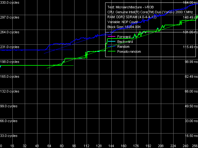 Напомним основной принцип работы относительного нового теста RMMA, позволяющего оценить глубину буфера переупорядочивания инструкций (I-ROB): запускается одна простая, но долго исполняемая инструкция операция зависимой загрузки последующей строки данных из памяти, mov eax, [eax], а сразу вслед за ней серия очень простых, не зависящих от нее операций (nop). Тогда, в идеализированном случае, как только время исполнения такой связки начинает зависеть от количества NOP-ов, можно считать, что глубина ROB исчерпана.