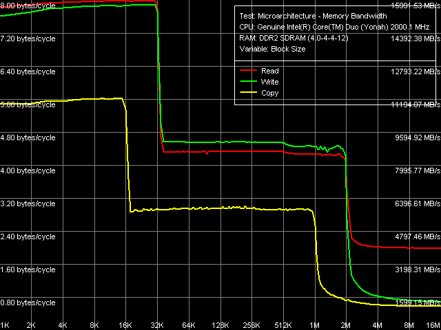 Кривые зависимости пропускной способности определенной области памяти от размера блока (рис. 1) внешне практически идентичны кривым, полученным ранее на процессоре Pentium M (ядро Dothan ревизии C0).