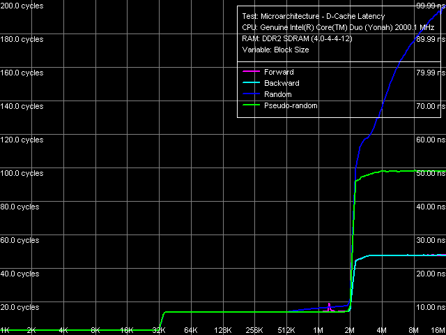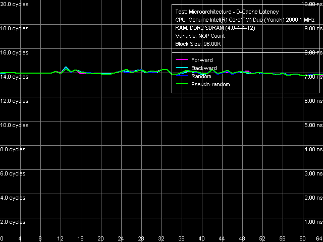 Из количественных оценок средних величин латентностей L1/L2-кэша и памяти (табл. 5) можно заметить наиболее существенное отличие ядра Yonah от Dothan, заключающееся в возрастании латентности L2-кэша с 10 до 14 тактов. Что ж, введение значительно более сложной схемы управления L2-кэша, заключающейся в эффективном распределении объема данного ресурса между физическими ядрами процессора, не может пройти незаметно и увеличение латентности L2-кэша на 4 такта при сохранении (и даже возрастании) его превосходных скоростных характеристик можно считать весьма малой ценой.