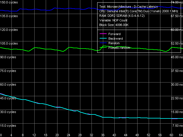 В первом случае (рис. 6), ощутимых отличий от Dothan практически не наблюдается (в связи с чем, мы не приводим соответствующие кривые), за исключением того, что максимальная эффективность аппаратной предвыборки достигается несколько раньше, при вставке порядка 36 NOP-ов между соседними обращениями к памяти. Минимальная латентность прямого/обратного обхода достигает 10.1 нс (для сравнения, 9.2 нс на Dothan), псевдослучайного 46.9 нс (против 48.2 нс), случайного 69.0 нс (против 72.5 нс). Таким образом, существенных изменений задержек при доступе в оперативную память с аппаратной предвыборкой на новой платформе не наблюдается.