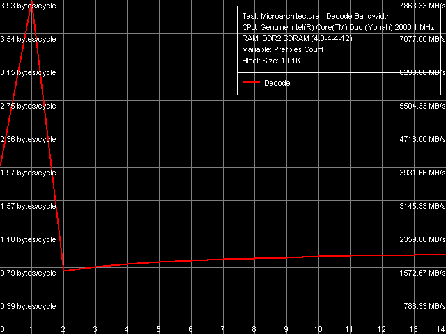 Более подробную картину эффективности декодирования/исполнения инструкций с префиксами дает одноименный тест, в котором исполняются инструкции вида [0x66]nNOP, где n = 0..14. Общая картина этого теста (рис. 12) не изменилась такой вид типичен для всех процессоров микроархитектуры P6, начиная с Pentium III (вполне вероятно, что и Pentium PRO/Pentium II просто мы их не исследовали). Наибольшая эффективность «отсечения» префиксов наблюдается лишь при их количестве, равном единице, после чего (по мере увеличения их количества) происходит резкое уменьшение скорости декодирования/исполнения таких инструкций (особенно если пересчитать полученный результат в количество инструкций, исполняемых за такт процессора).