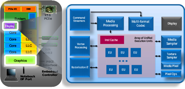Видеоядру обещана удвоенная производительность, и не только за счёт быстрого кэша L3, но и от удвоения числа исполнительных блоков до 12 — правда, не во всех моделях, о чём на диаграммах умалчивают. Также внедрена поддержка DirectX 10 (а на дворе уже 11-й…) и новых форматов HD-видео для энергоэффективного аппаратного ускорения (де)кодирования.