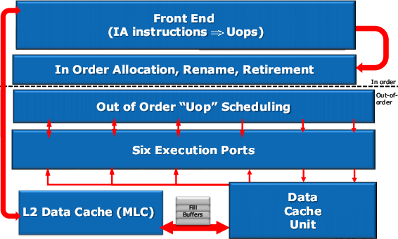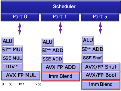 Чтобы благие начинания не остались только на уровне распознавания команд AVX, блок ФУ переделан для обработки регистров ymm с такой же скоростью, как и xmm. Для этого 128-битные сумматор, умножитель, АЛУ и перетасовщики удвоили разрядность, соответственно подняв пиковую производительность ядра.