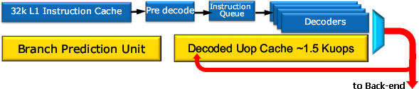 Во фронте главное нововведение — кэш на 1536 мопов, буферизирующий результаты работы декодеров. Также переработан предсказатель переходов, хранящий теперь вдвое больше целевых адресов и более долгую историю поведения команд. К нему подключен блок, определяющий попадания в моп-кэш, и в этих случаях кэш L1I, предекодер-длиномер и декодеры отключаются, экономя энергию. Также увеличивается производительность за счёт улучшения реакции на неверно предсказанный переход (правильная ветвь может оказаться в моп-кэше) и освобождения от необходимости декодировать длинные команды за несколько тактов при каждом их исполнении.