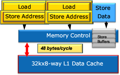 Кэш L1D на 50% повысил полную пропускную способность — теперь это 32 байта чтения + 16 байт записи за такт. Для этого в LSU (контроллер L1D) поставлен второй 16-байтовый порт чтения. Это позволит в нужном темпе насыщать ФУ данными при исполнении AVX-кода.