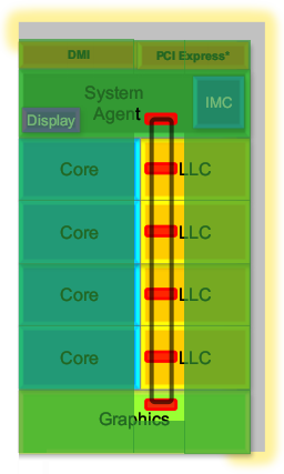 Во внеядре (так Intel называет остальную часть ЦП, не вошедшую в ядра общего назначения) список изменений открывает как-бы-новая (появившаяся ещё в марте 2010 г. в 8-ядерных серверных чипах Nehalem-EX) 32-байтовая кольцевая шина, связывающая кэш L3, вычислительные и графическое ядра и «системный агент» (бывший северный мост с ИКП для памяти типа DDR3). L3, обозначенный как LLC (last level cache, кэш последнего уровня), состоит из нескольких банков (по числу ядер общего назначения) с портом доступа в каждом. Связывающая всё это кольцевая шина работает на частоте, сравнимой с частотой ядер, и в идеале за такт передаёт количество данных, равное произведению 32 на число банков. Этим способом производительность разделяемого L3 увеличивается пропорционально числу ядер, а вот обещанное уменьшение задержек (по крайней мере в тактах) сомнительно по сравнению с централизованным контроллером L3.