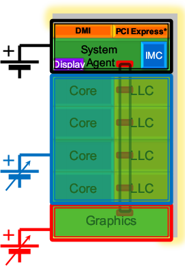 ЦП будет получать тройное питание — для ядер общего назначения и L3, для GPU, а также для системного агента с контроллерами всевозможных шин. Пока не ясно, имеют ли все линии автоподстройку под текущую загрузку, т. к. на приведённом слайде напряжение системного агента указано как фиксированое, а в тексте к другому написано, что регулировать можно все вольтажи.