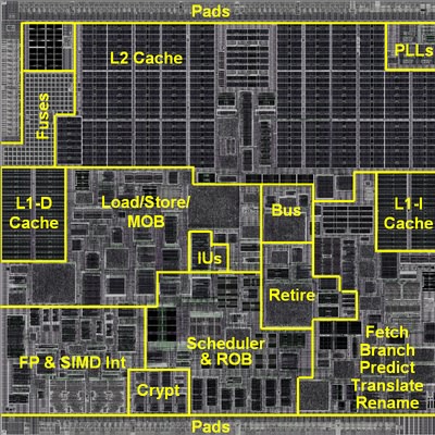 Через год скитаний на это клюнула IDT, и через 2 года (в 1997-м) получила результат — WinChip C6. Ещё за 2 года Centaur успела выпустить 3 версии чуть обновлённого WinChip 2, после чего её перекупила VIA. Там «кентавры» всего за 5 лет родили 6 версий C3 и C7, отличавшихся от WinChip в основном размерами кэшей, степенью интеграции и внедрением очередного SSE*. Isaiah же требовал кардинального усложнения, а значит, и увеличения затрачиваемых ресурсов, поэтому на него потратили аж 4 года. VIA дала архитектуре библейское имя пророка Исайи (как и предыдущим решениям Centaur, например C7 Esther — Есфирь), а инженеры для себя назвали её CN (видимо, C-next) и делали её как бы с нуля, хотя по сути изобретали 3-колёсный 3-конвейерный велосипед — даром что название владельца расшифровывается как Very Innovative Architecture… Кстати, об именах: кодовое имя ядра Атома Bonnell — название холмика вблизи Остина, ну а VIA назвала «стряпню техасской кухоньки» именем минус девятой степени :) Ниже везде под VIA подразумевается Centaur.