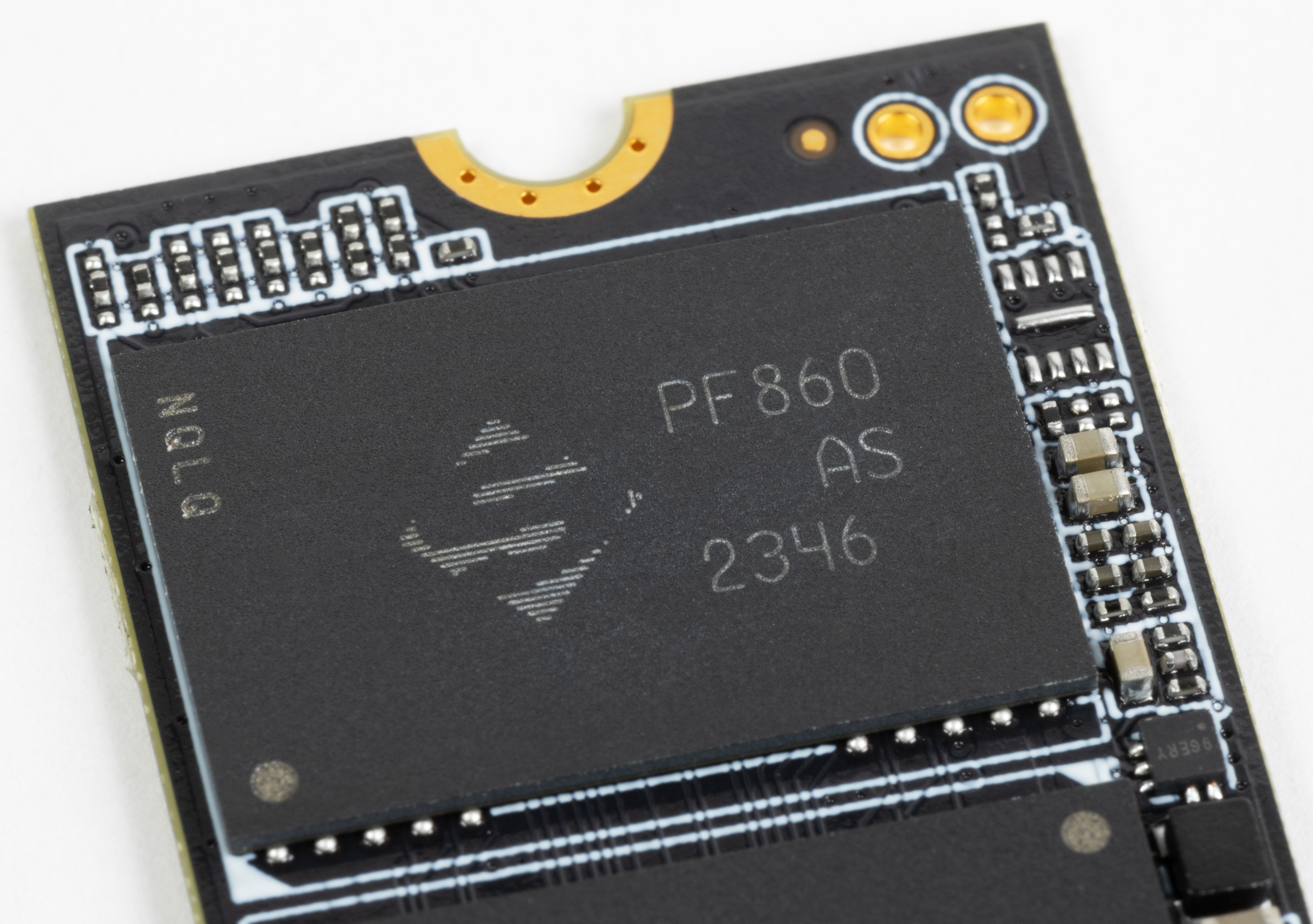 Но мы все-таки снимем фронтальную наклейку, и полюбуемся на стандартный же референс-дизайн Maxiotek MAP1202. Что скорее хорошо, чем плохо — из недорогих Gen3-контроллеров он, пожалуй, что, лучший. Почему и актуален до сих пор: чуть позже прочих на рынок вышел — чуть позже может и уходить. На памяти читается маркировка Spectec — по поводу которой некогда принято было крутить носом. Однако с тех пор мы успели полюбоваться и на самые причудливые варианты фасовки — вообще не позволяющих даже предположить, кем она делалась. И, главное, как память при этом сортировалась по качеству. Так что на этом фоне Spectec начинает выглядеть уже если не приятнее, то, как минимум, менее пугающе.