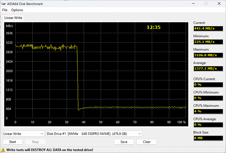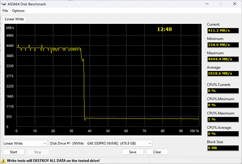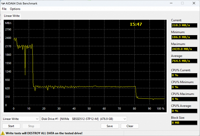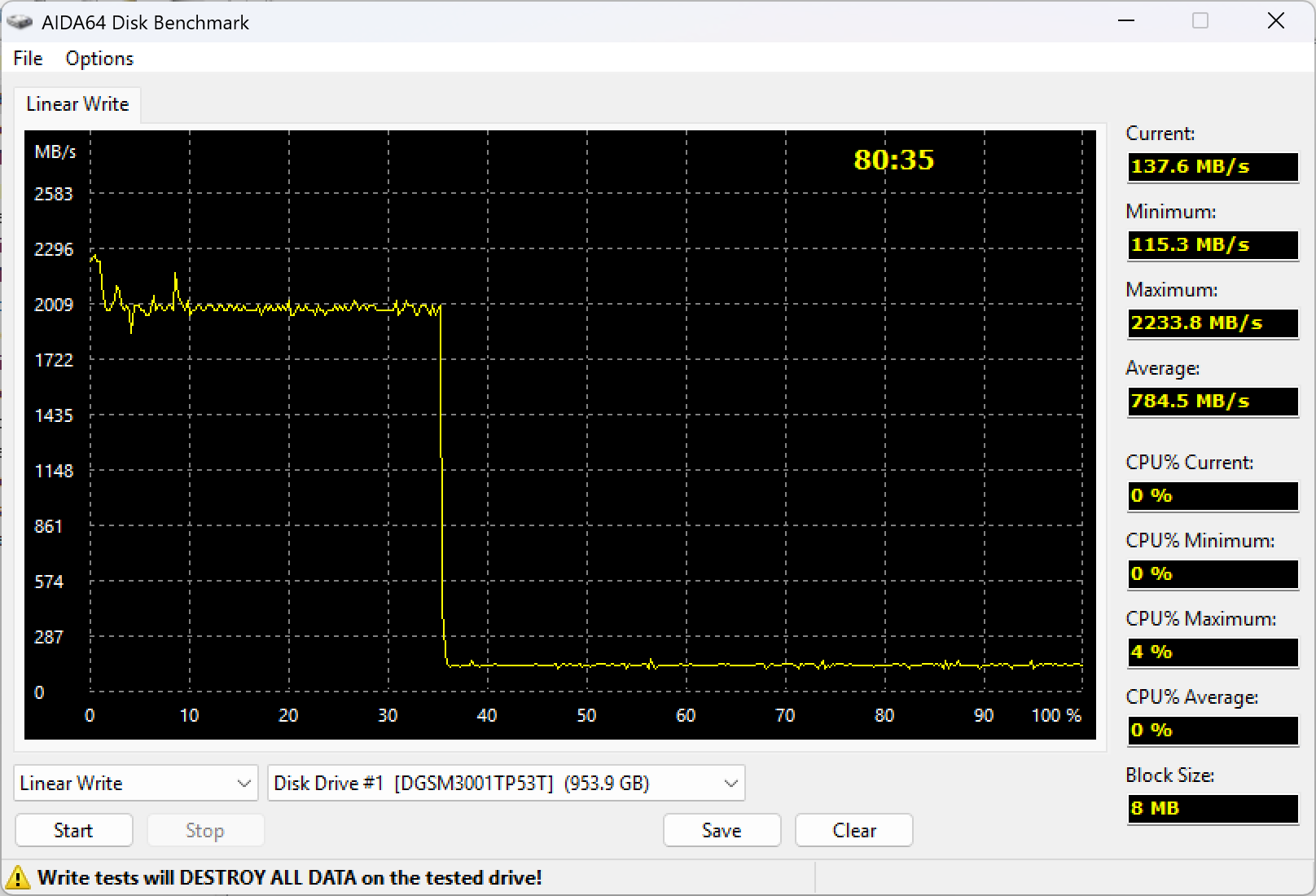 Откатываемся немного назад во времени разработки контроллера, но ставим современную память на терабитных кристаллах, сдабриваем всё неоптимальной для контроллеров Phison прошивкой — и получаем поведение, схожее уже со многими моделями на QLC-памяти, причем не самыми быстрыми. По крайней мере, по скорости «распихивания» данных, лишь немногим большей, чем 100 МБ/с. Да и запись в кэш опять упирается в собственные возможности связки «контроллер — память», причем не спасает и двукратное (ибо тут 1 ТБ) чередование. Потенциальный аутсайдер тоже определился — и это не наш главный герой. Впрочем, как мы уже не раз писали, торопиться в адепты секты Свидетелей записи за кэшем не стоит. Это довольно интересный тестовый сценарий, позволяющий понять некоторые аспекты внутренний жизни накопителей, но его практическую значимость некоторые явно переоценивают.