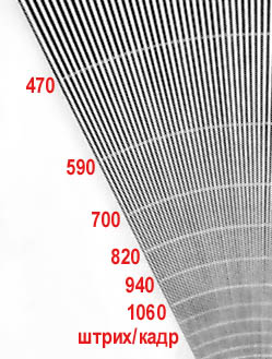 Для оценки разрешения снималась радиальная мира. Разрешение оценивалось в числе линий (белый штрих и черный штрих — это два штриха) на кадр. Ясно, что в идеальном случае, когда штрих сфокусирован точно на чувствительный элемент, разрешение совпадет с числом пикселей, а если линия сфокусирована точно на промежуток между чувствительными элементами, то различить не удастся ни одной линии. Поскольку чувствительные элементы в матрице расположены в виде параллельных рядов, а штрихи в мире расположены под углом к этим рядам, то на снимке мы имеем чередование строк с максимальным и минимальным разрешением, что на фотографии выглядит как муар.