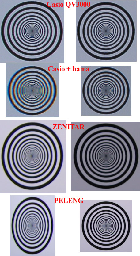 При проектировании объективов добиваются максимального совмещения в одной точке на оптической оси лучей двух цветов: с длиной волны 480 или 435,8 нм и 643,8 нм. Такие объективы называются ахроматами. Если же совмещаются лучи трех цветов: 435,8 нм, 546,1 нм, 643,8 нм — то такие объективы называются апохроматами. Как видно из наших тестов, объектив Canon, установленный на камере Casio QV 3000, можно отнести к ахроматам, поскольку синий и красный лучи сведены, а зеленый дает ореол на границе черного штриха.