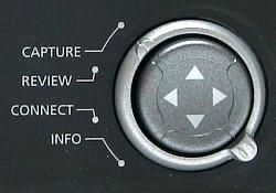 В правом нижнем углу находится четырехпозиционный поворотный переключатель основных режимов камеры и джойстико-подобный манипулятор, для навигации по LCD дисплею.