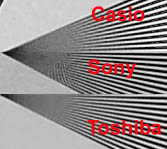 Камеры показали очень близкие результаты, как по разрешению, так и по спектральным характеристикам. Впрочем, можно отметить, что изображение, получаемое камерой Casio, несколько мягче остальных, а у камеры Sony при максимальных разрешениях ограничение наступает не из-за того, что яркость светлых и темных полос становится одинаковой, а из-за ярко выраженного муара.