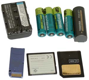 Аналогичная история и с аккумулятором. Casio использует 4 стандартных элемента питания размера АА, этот могут быть как Ni-Cd, так и Ni-MH аккумуляторы, или простые батарейки этого размера. Sony и Toshiba используют аккумуляторы собственной конструкции, причем, если ионные аккумуляторы NP-FM50 емкостью 1180 мА·ч достаточно доступны, поскольку используются видеокамерами Sony, то аккумуляторы от Toshiba не только самые маленькие по размеру, а значит, и с наименьшей емкостью, но еще и являются довольно большой экзотикой на просторах севера Евразии. Зарядным устройством для аккумуляторов, как у Toshiba, так и у Sony, является сама камера, которая подключается к сети переменного тока через блок питания. Он обеспечивает как зарядку аккумуляторов, так и питание от сети. Важным свойством, которое выделяет камеру Sony, является индикация оставшегося заряда в минутах.