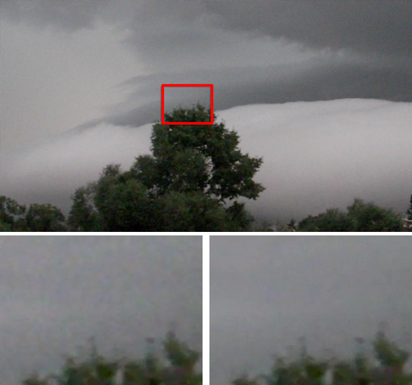 Слева - "кропнутый" кадр из неочищенного видео. Справа - из обработанного "шумодавом". Оба рисунка сжаты в Photoshop с качеством JPG = 80%.