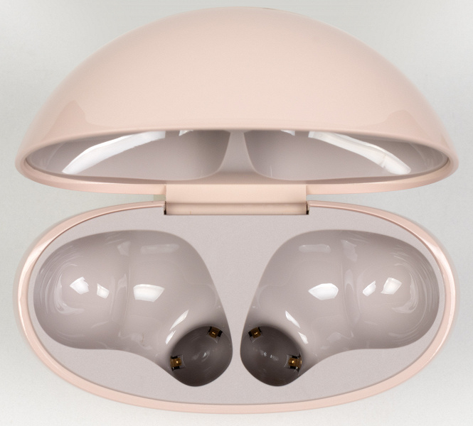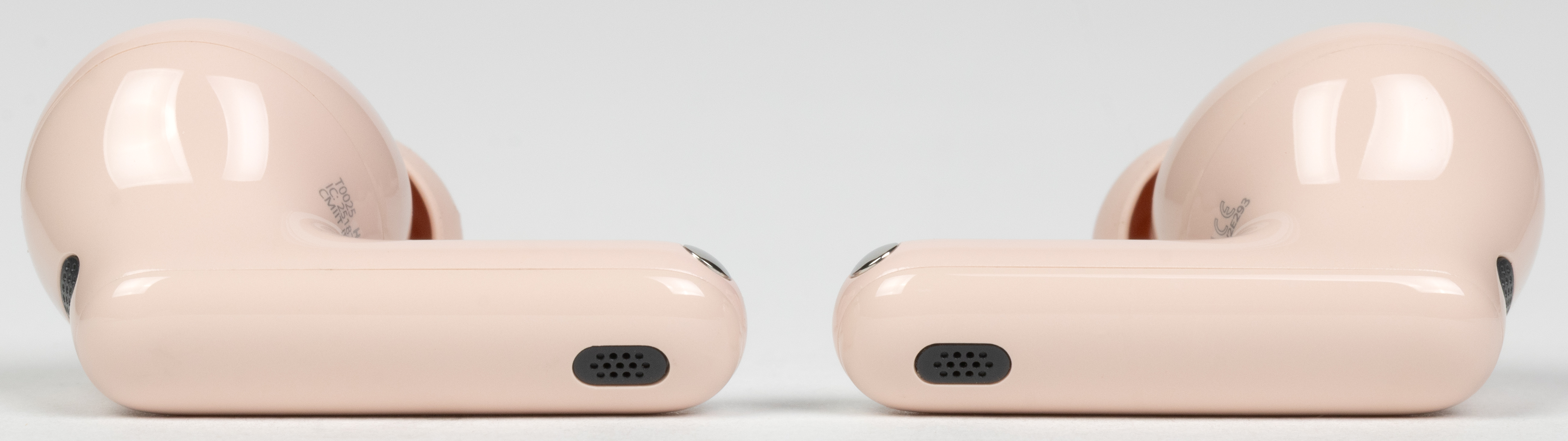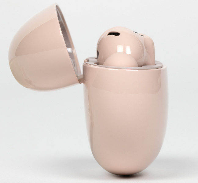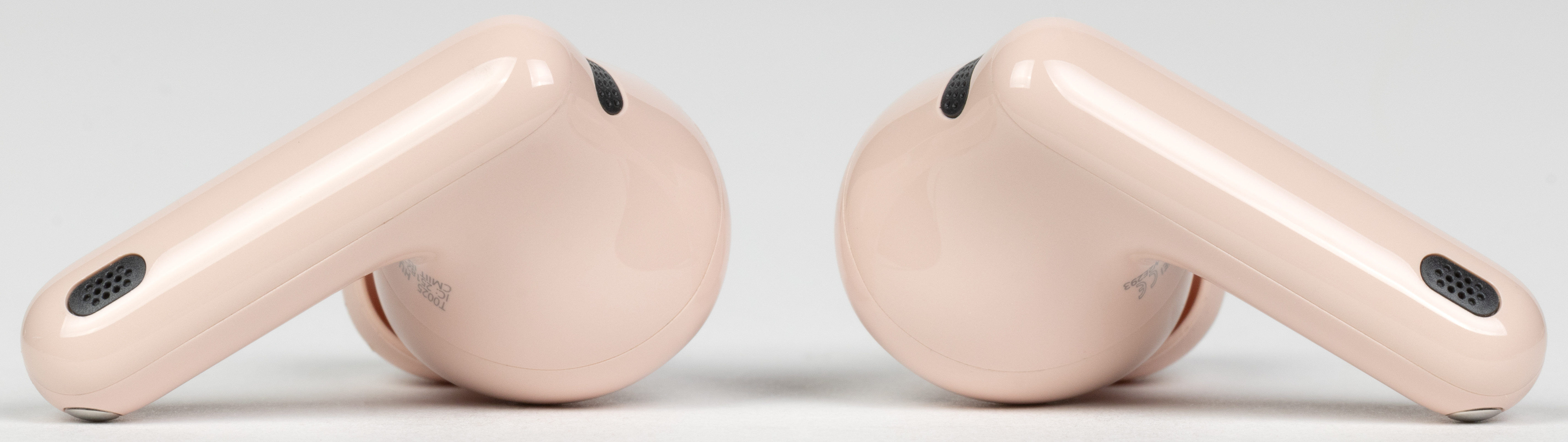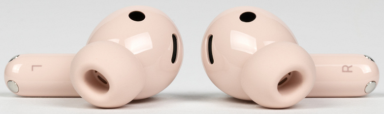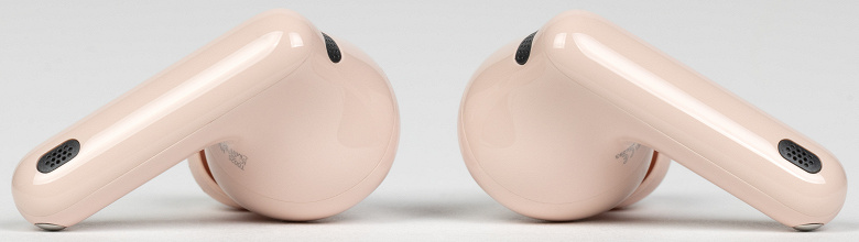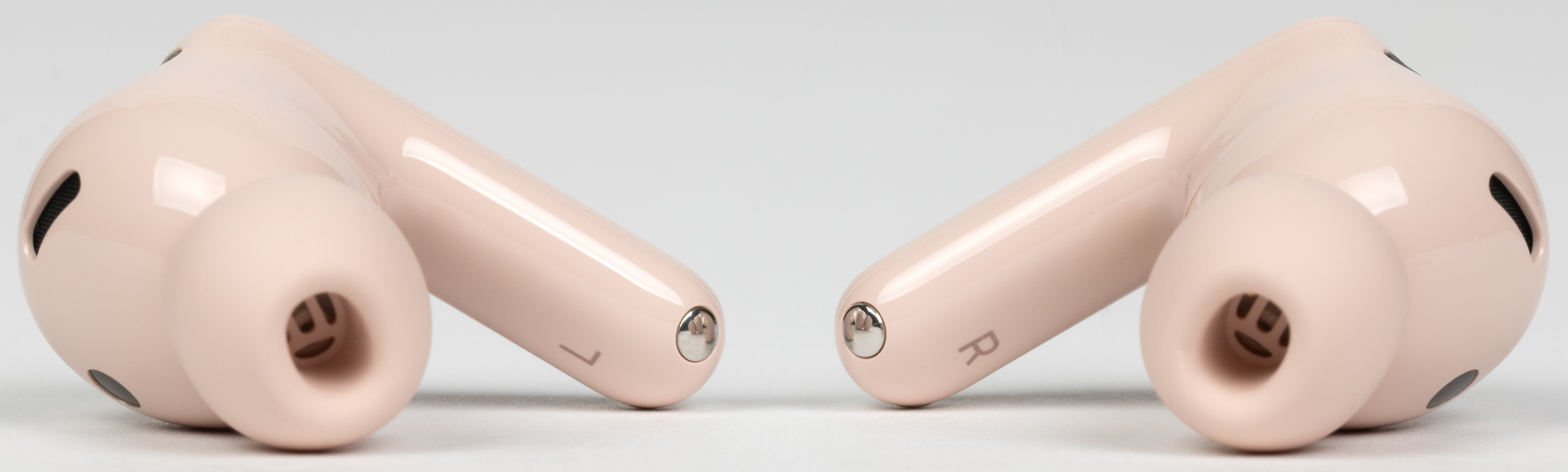 На внутренней стороне «ножек» нанесены обозначения левого и правого наушников. Внешняя панель сенсорная, но визуально это никак не выделено — в отличие от некоторых других TWS-наушников здесь нет характерных углублений или текстурированных участков, помогающих легче нащупывать сенсорную зону. Впрочем, это скорее дополнительная удобная мелочь, а не обязательный элемент, потому ее отсутствие вряд ли можно считать недостатком.