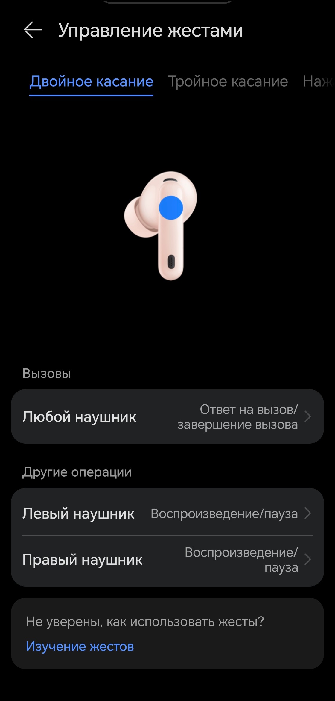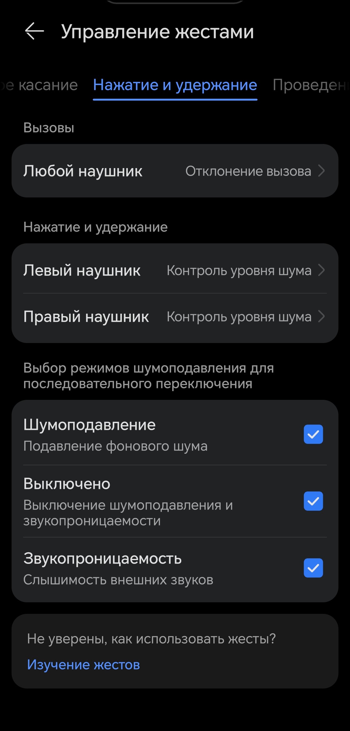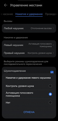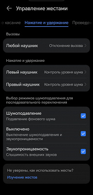 Касание и удержание отвечает за переключение режимов шумоподавления — при этом в настройках можно выбрать, между какими именно режимами переключаться. Свайпы управляют громкостью. Эту функцию можно только отключить — переназначить на другое действие нельзя.