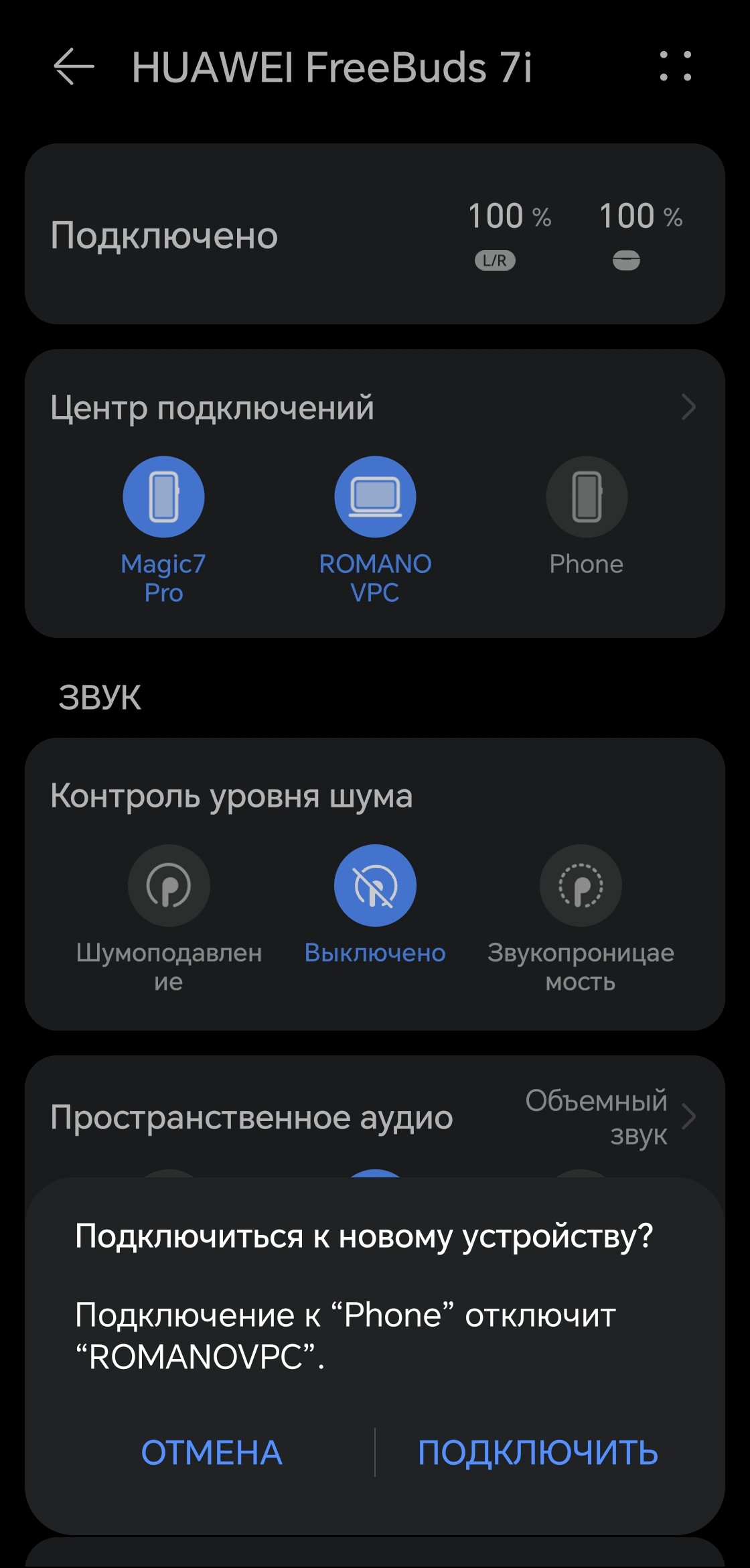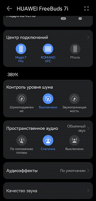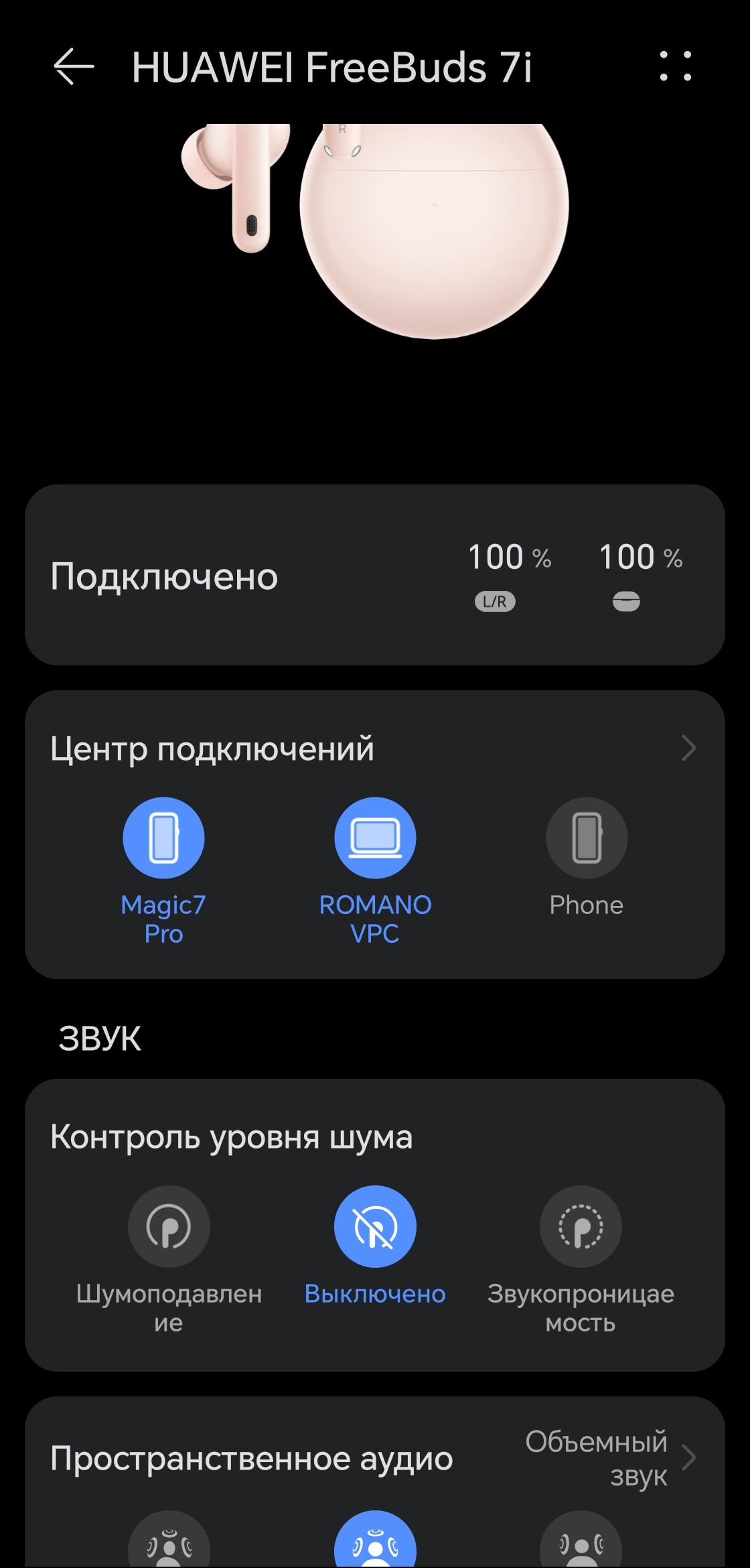Одно из самых интересных нововведений Huawei FreeBuds 7i — так называемое пространственное аудио. В статичном режиме оно просто добавляет дополнительного объема за счет реверберации. На музыкальном материале это звучит довольно спорно, хоть порой и эффектно. А вот в кино такая подача, как правило, оказывается к месту. При активации режима отслеживания положения головы звуковая сцена «привязывается» к экрану — при повороте головы создается ощущение, что источник звука остается на месте. Возникает эффект, будто звук идет не из наушников, а напрямую с устройства — смартфона или планшета перед вами. Поворачиваете голову — и звук смещается в одно ухо, как если бы экран действительно оставался неподвижным. Деталь вроде бы и незначительная, но в долгом и утомительном перелете, например, способна добавить немного уюта, который точно не будет лишним.