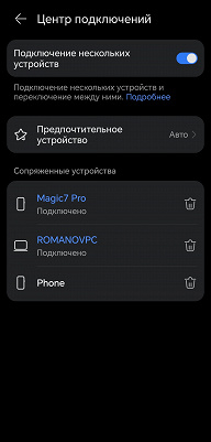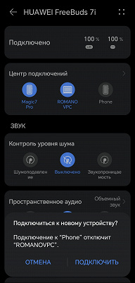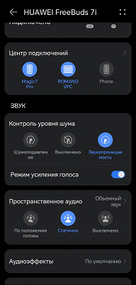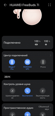 Под изображением гарнитуры на главном экране находится модуль, в котором отображается уровень заряда наушников и кейса. Далее размещен виджет центра подключений, который мы неустанно хвалим — Huawei первыми организовали его таким образом, сейчас мы периодически встречаем нечто подобное у других производителей. На странице его настроек можно увидеть полный список сопряженных устройств с возможностью удалить ненужные, а также выбрать предпочтительные, если это необходимо. Мы за все годы тестирований наушников Huawei так и не смогли найти причин воспользоваться этой опцией — автоматика отлично справляется сама, оперативно переключая фокус между устройствами в нужный момент.