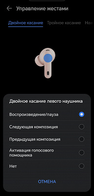 Доступна и настройка тройного касания, но выбора, по сути, нет — можно назначить только переключение треков. Соответственно, имеет смысл оставить за двойным нажатием управление воспроизведением, а при необходимости — добавить на один из наушников активацию голосового ассистента.