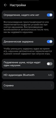 Датчики ношения работают корректно: если вынуть один наушник, воспроизведение приостанавливается, а при возврате — автоматически продолжается. Есть и дополнительная функция — при извлечении одного наушника активируется режим звуковой прозрачности. Это позволяет избежать неприятного ощущения «давления», которое часто возникает, когда в ухе остается только один наушник с активным шумоподавлением. Опция включается в настройках, там же можно полностью отключить автопаузу. В этом же разделе доступны выбор активного кодека, настройка динамической задержки (режим с пониженным битрейтом для игр) и обширная справка в формате вопросов и ответов.