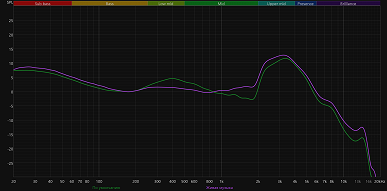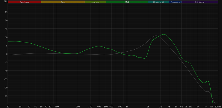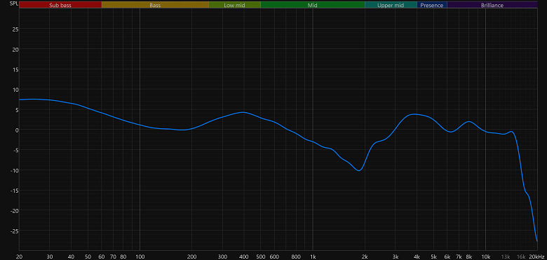 Акцент в области 350—400 Гц — одна из ключевых черт тюнинга наушников. С одной стороны он может добавить «телесности» звучанию вокала и инструментов, с другой — помешать восприятию средних частот, заметно снизив уровень детализации, особенно в плотных миксах. Более остро это ощущается на фоне отчетливого снижения уровня средних частот в диапазоне от 1 до 2 кГц, из-за чего вокал звучит менее естественно, а акустические инструменты теряют реализм. Зато такая настройка дополнительно подчеркивает края диапазона, и это точно оценят поклонники V-образного звучания.