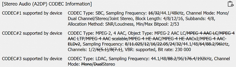 Полный список поддерживаемых кодеков и их режимов мы, как обычно, получили с помощью утилиты Bluetooth Tweaker. Кодеков три, как и заявлено: SBC, AAC и LDAC. Для SBC максимальное значение параметра Bitpool установлено на уровне 53, тогда как рекомендуемый профиль High Quality предполагает 51. У AAC битрейт ограничен, но на вполне приемлемом уровне — 230 Кбит/с. В обоих случаях кодеки работают на пределе своих возможностей или близко к нему.
