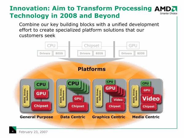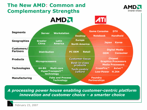 Те, кто еще не в курсе, зачем AMD приобрела ATI, могут прояснить ситуацию, глядя на этот слайд. Не только ради чипсетов. Но и, например, для географического расширения сфер влияния за счет стран, где AMD была представлена, лучше, чем ATI (и наоборот). Равно как и для охвата новых рыночных ниш (в частности, ATI полностью «отвоевала» у NVIDIA рынок игровых консолей, а он весьма велик). И, разумеется, для получения готовых платформенных решений, состоящих из графического и центрального процессоров и чипсета.