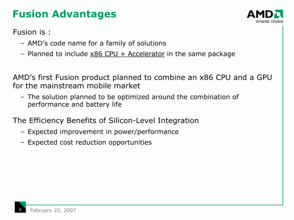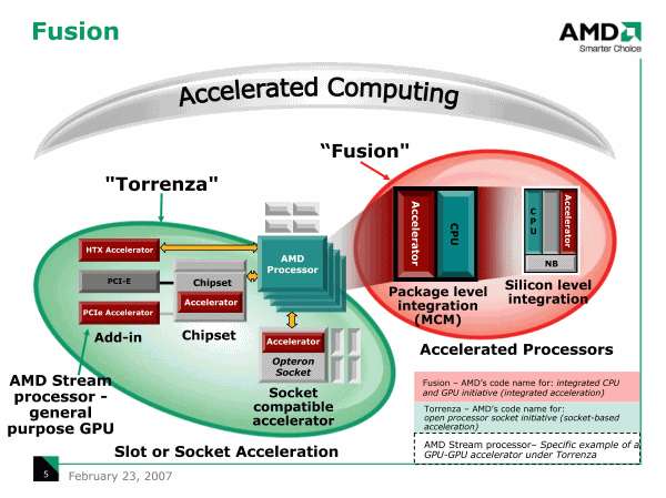 Что касается Fusion, которая в отличие от Socket-based интеграции в Torrenza, предусматривает Chip-based интеграцию специализированных сопроцессоров на общий кристалл с центральным процессором, то здесь, по очевидным причинам, все зависит от самой AMD. И, как уже анонсировалось, первым продуктом, нацеленным на сегмент мобильных компьютеров, должен стать процессор, объединяющий вычислительное и графическое ядро.