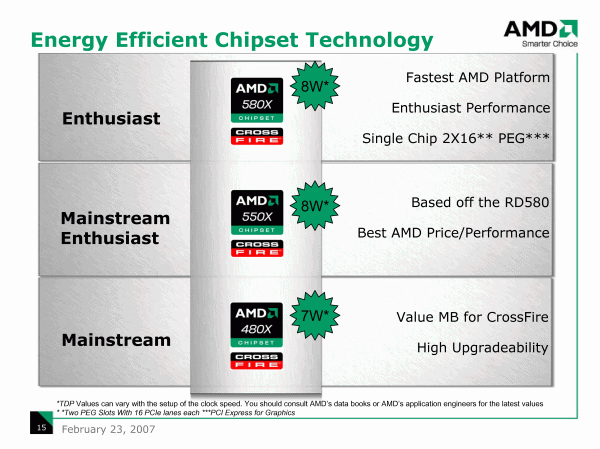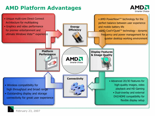 Переходя от стратегических планов к текущей ситуации, Джузеппе Амато выделил несколько преимуществ AMD-платформы, которые конкуренту, несмотря на выпуск весьма удачных продуктов в прошлом году, так и не удалось превзойти. Первое и очевидное — экономичность, с переходом на 65 нм SOI-техпроцесс, стандартный тепловой пакет для Athlon 64 X2 снизился с 89 до 65 Вт, а для одноядерных Athlon 64 с 62 до 45 Вт, что в сочетании с экономными чипсетами, обеспечивает лучшую «энерго-эффективность» системы в целом.