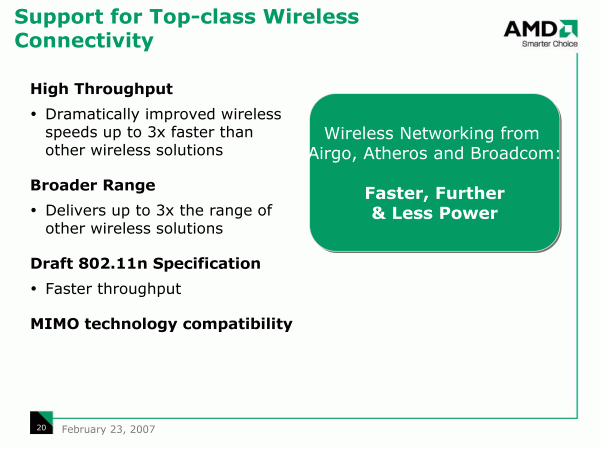 Гораздо более неожиданное замечание касается ноутбуков с модулями Wi-Fi, которые, как известно, AMD использует от сторонних производителей (Airgo, Atheros и Broadcom), тогда как Intel продвигает собственные.