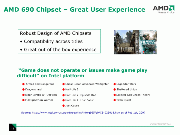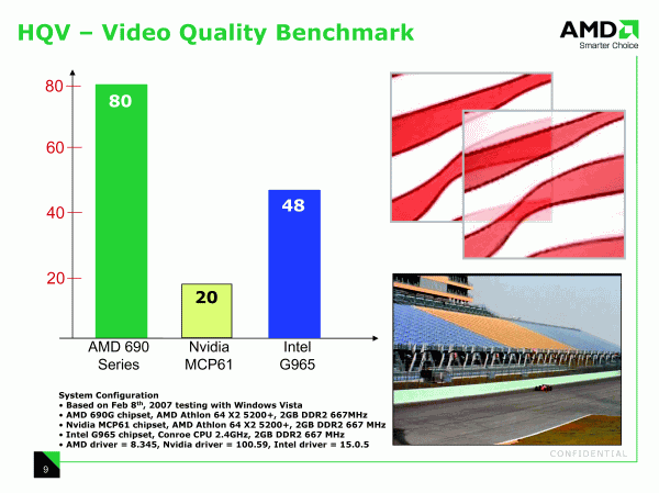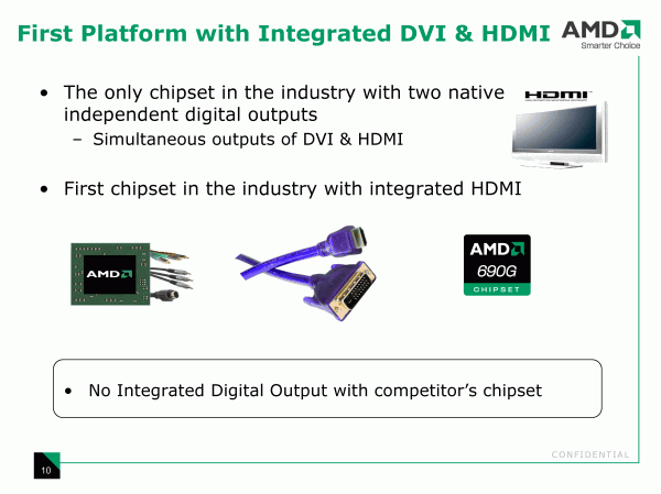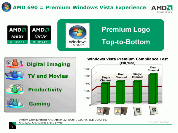 Для систем с интегрированной графикой, вопросы стоимости — ключевые, и здесь AMD подчеркивает необходимость учитывать не только цену процессора, но и платы, а мы заодно помечаем для себя, что AMD 690G выступает не в качестве пополнения линейки (более оснащенного и производительного, а, следовательно, дорогого относительно предшественника (Radeon 1150)), а является заменой.