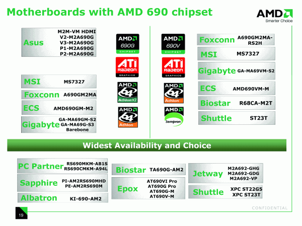 В завершении официальной части приводим показательный кадр. Среди компаний, намеренных выпустить (или уже выпустивших) платы на AMD 690G, заметны и те, кто ранее чипсеты ATI не использовал.