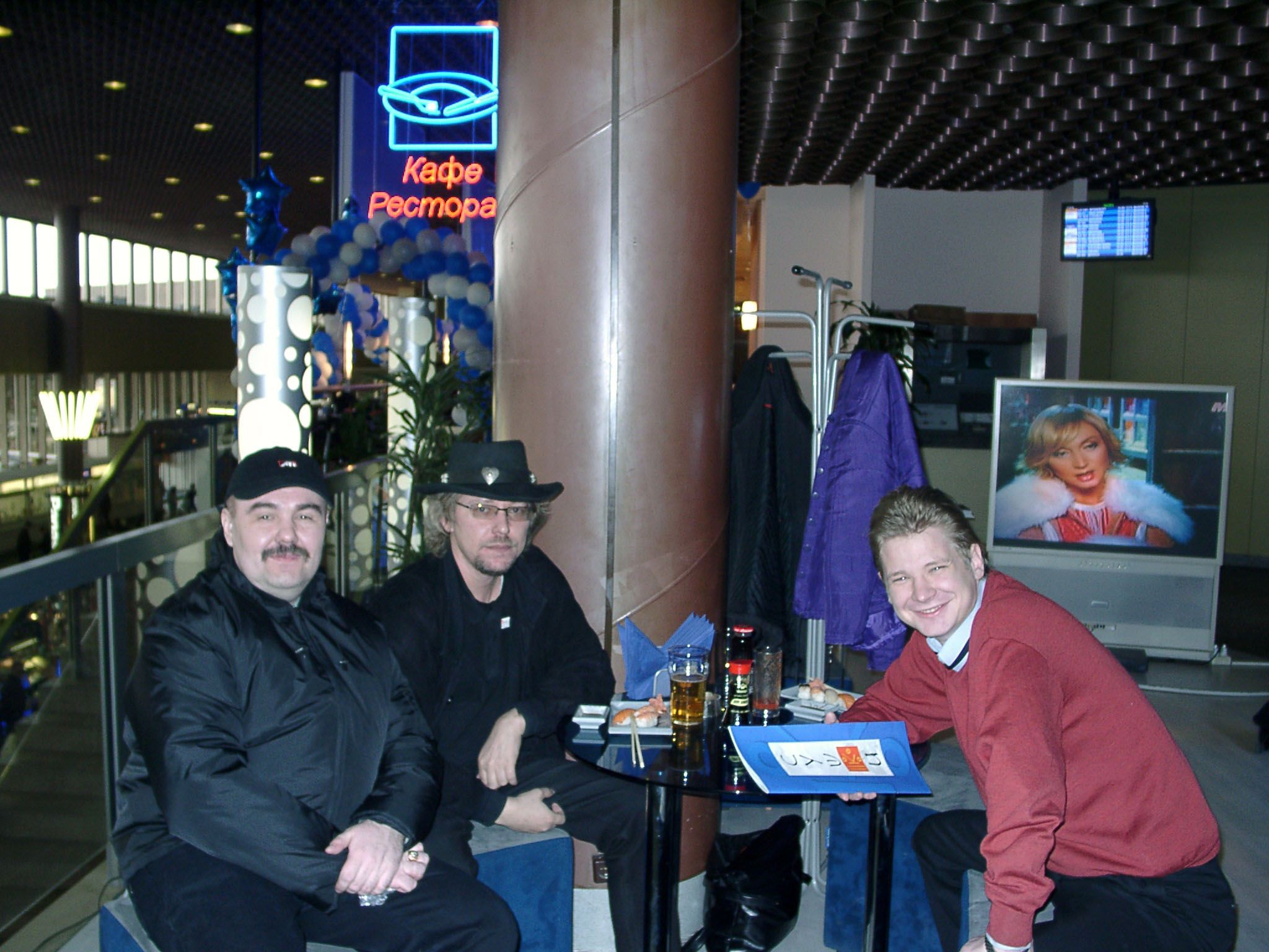 | И вот мы в аэропорту Шереметьево-2. Последние прощания, посиделки в японском ресторанчике напоследок и в путь (слева-направо: я, Андрей Кузин и Николай Радовский — сотрудник московского офиса ATI, который очень сильно помог в организации данного мероприятия). Идем на регистрацию, проверки и тому подобное. Все прошло отлично, и мы заняли свои места в самолете. |
