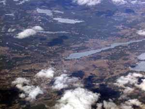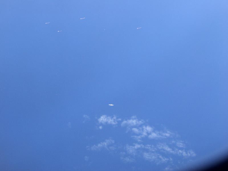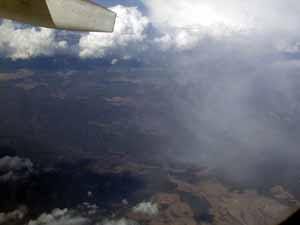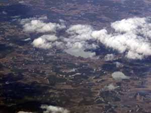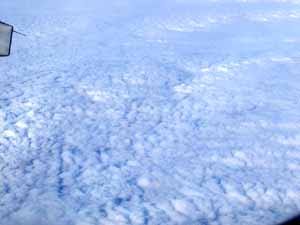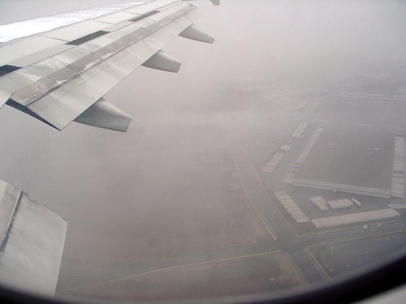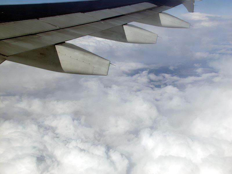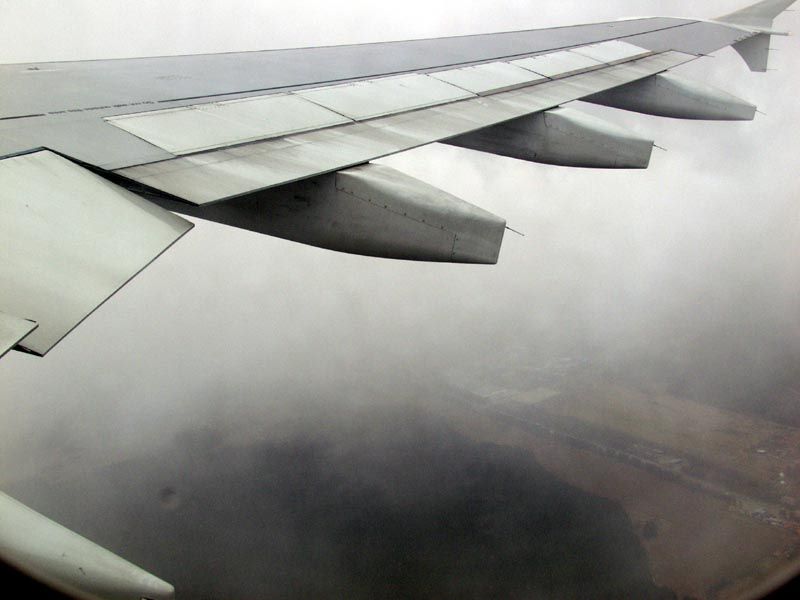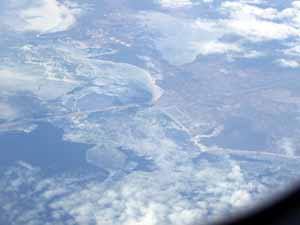 К сожалению, чем дальше мы летели на юг, тем плотнее становились облака, превратившись в конце концов в сплошной ковер (слева). Поэтому заснять уже цивилизованную Канаду с высоты 10000 метров не получилось. Самолет пошел резко вниз на посадку, и уже под пеленой облаков проявились первые очертания американской земли (справа).