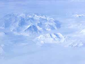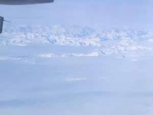 Но вот мы уже приблизились и к северо-американскому континенту, начав полет над ним, конечно же, все с тех же усыпанных вечным девственным серебром, гор. Это самый север Канады.