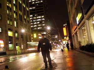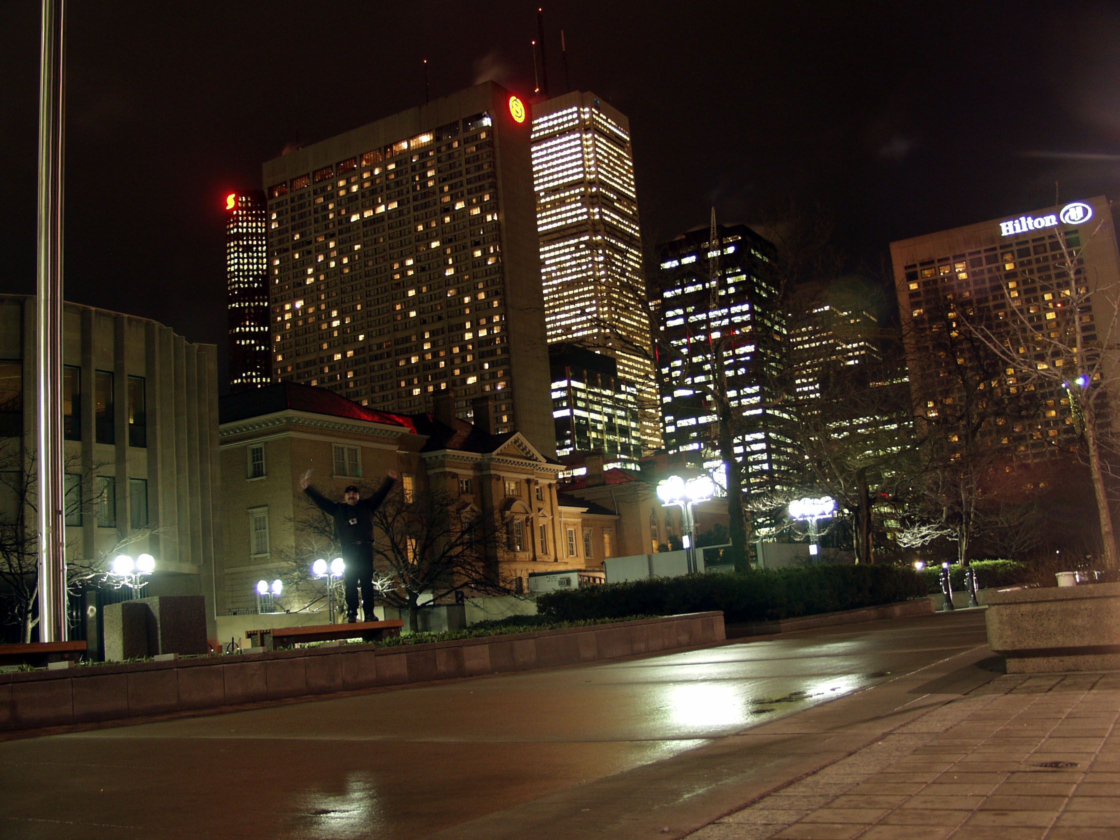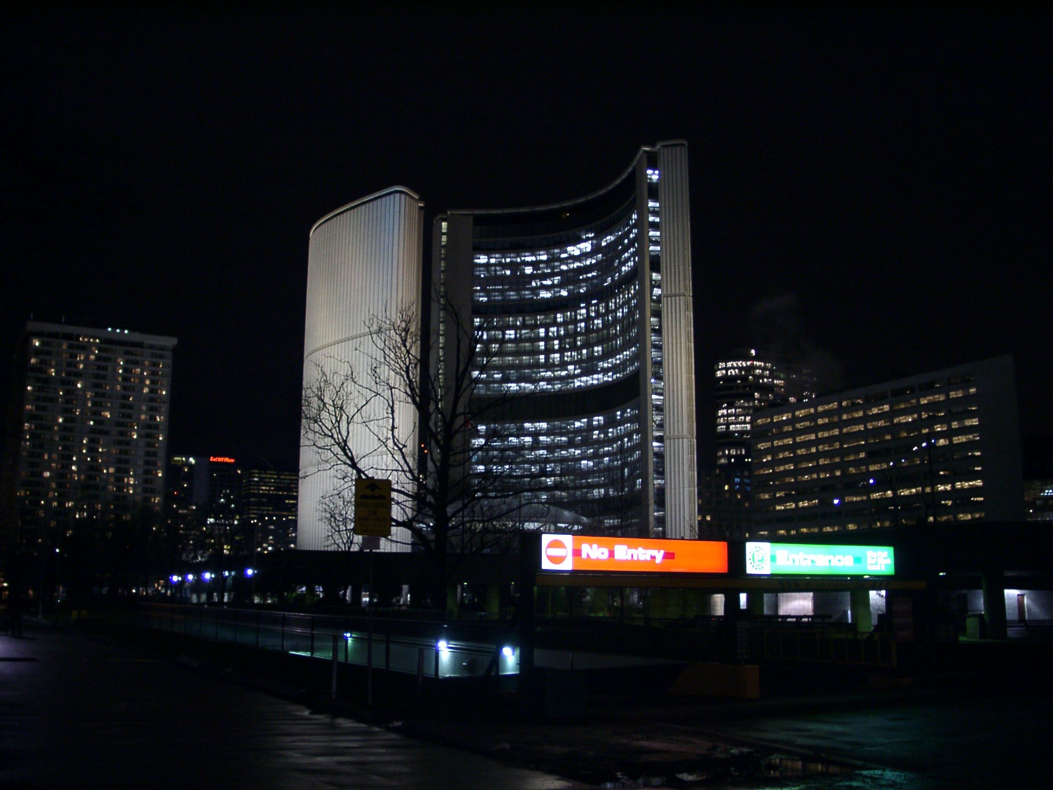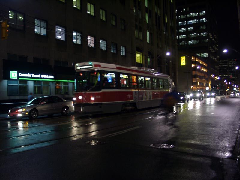 После этого мы решили прогуляться по вечернему (почти ночному) Торонто. На приведенном ниже блоке фотографий: слева вверху — это и есть Avenue Road около отеля, справа: вот такие трамваи ходят в Торонто (троллейбусов нет как класса, только еще автобусы есть). Слева внизу — вход в метро, а также интересный комплект из двух полукруглых зданий (это City Hall — в них размещается мэрия Торонто). Справа — просто вид на улицу, причем даже ночью видно, что дорожное покрытие в городе иногда весьма разбитое).