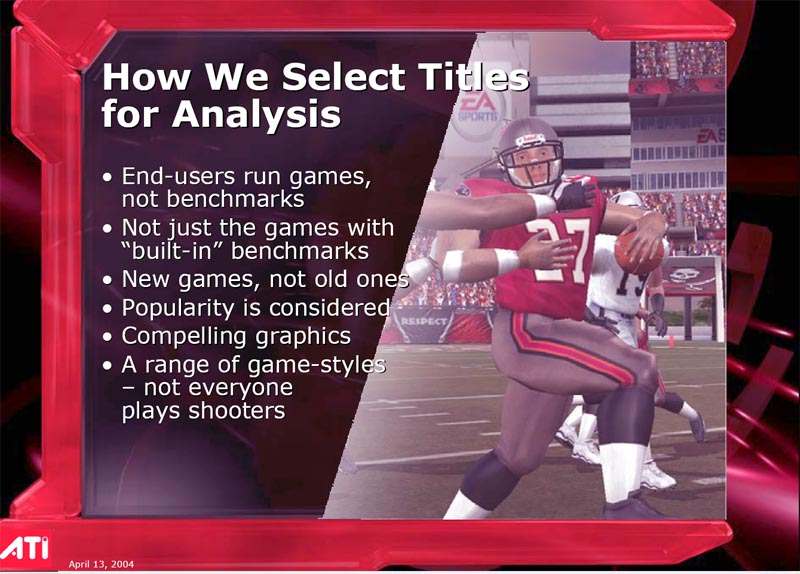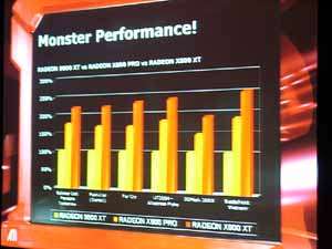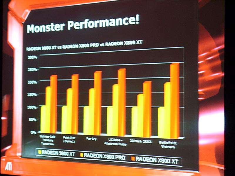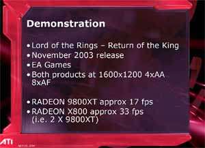 Его выступление затрагивало в целом ситуацию в ATI на сегодня, он рассказал о некоторых планах, ну и были продемонстрированы общие показатели по R420. Как можно видеть ниже, руководство компании не испытывает страха перед новинкой от конкурентов (NVIDIA), показывая на диаграммах весьма высокие скоростные параметры R420. Разумеется, о том, что у NVIDIA NV40 есть шейдеры 3.0, а у продукта из Канады их нет, предпочитают молчать, лишь при задавании вопросов на эту тему, идет ответ о том, что эта технология пока не нужна, и не зачем тратить на нее транзисторы в кристалле и людские ресурсы. Подробно об этом можно узнать, прочитав наше интервью с ведущими сотрудниками ATI.