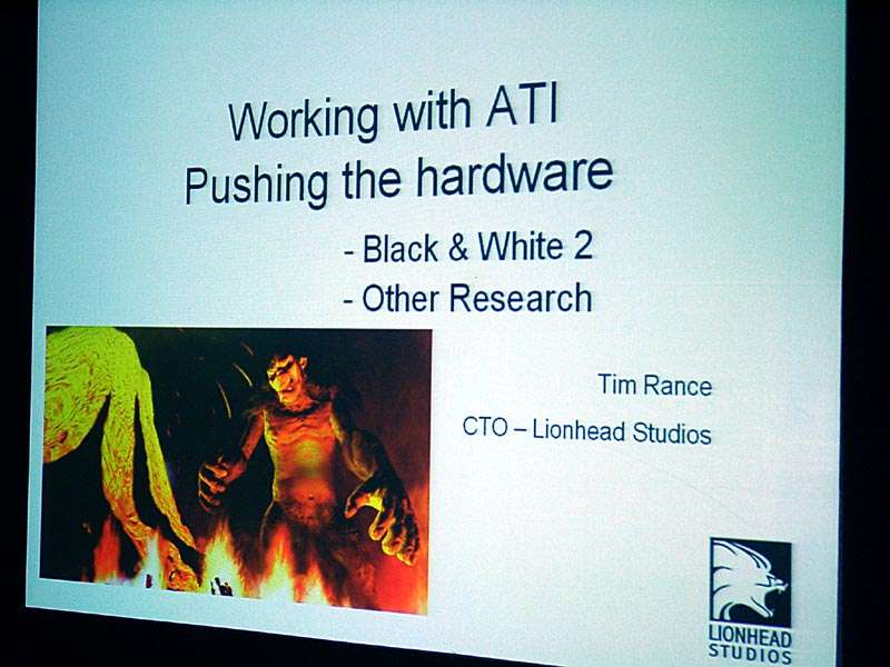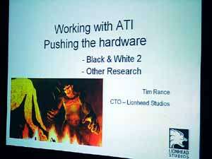 Затем выступил Тим Рэнс (Tim Rance), один из руководителей Lionhead Studios, он рассказал о будущем проекте Black & White-2, а также о некоторых технологических особенностях, которые им импонируют, и что именно им нравится в R420 в этом плане. Рассказ о новой игре сопровождался показом (3 МБ) трех (3 МБ) демо-роликов (4,8 МБ).