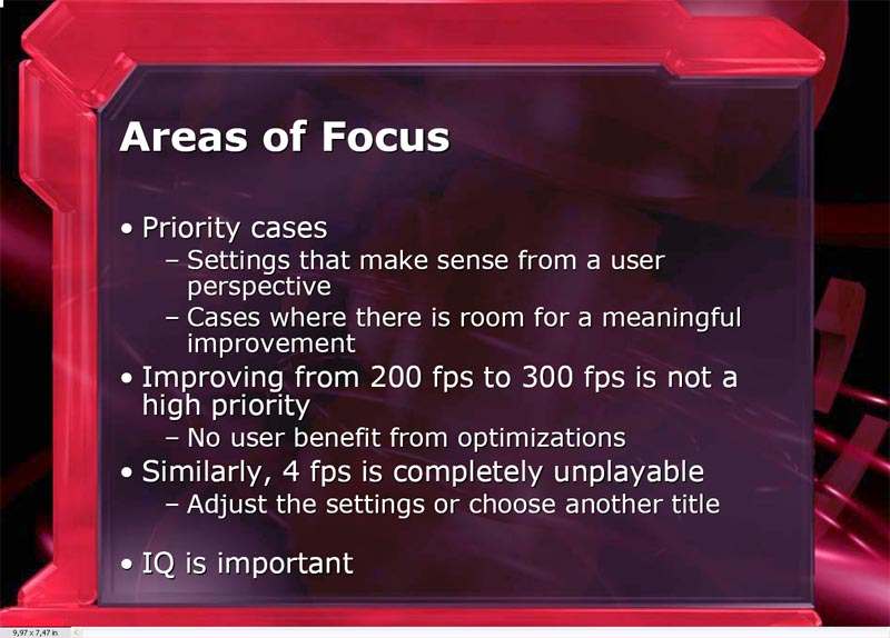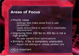Далее была показана классификация игр по годности к бенчмарку, а также затронуты темы узких мест в играх и их упорядочивание. Это упирание в частоту центрального процессора, геометрический движок, блок шейдеров и т. д. На слайдах ниже приведены примеры каждого такого случая с перечислением даже названий игр, которые можно отнести к той или иной категории bottleneck.