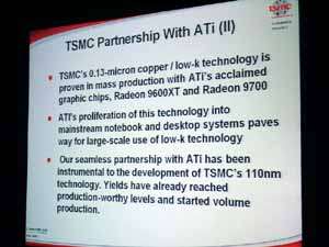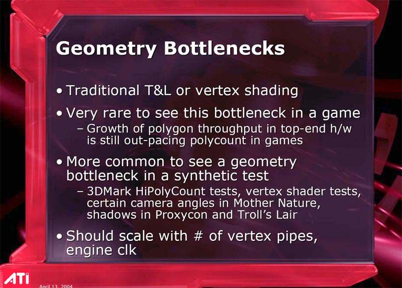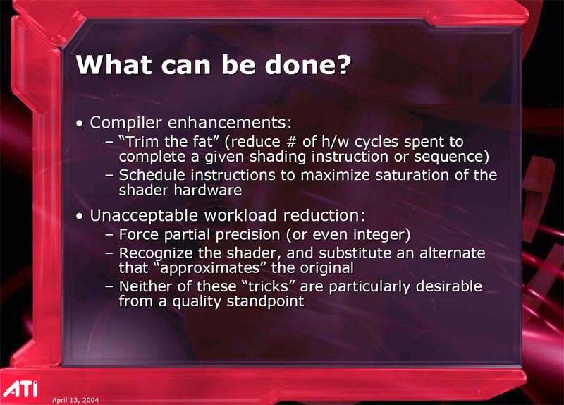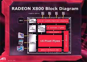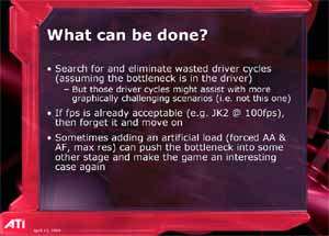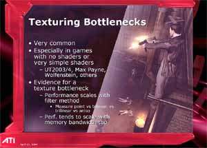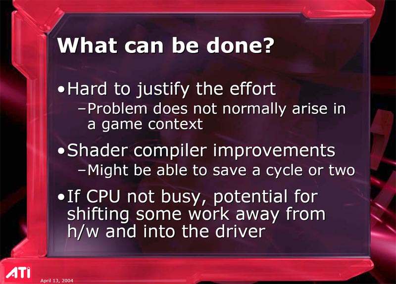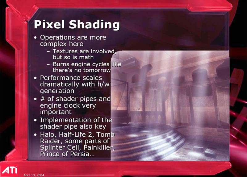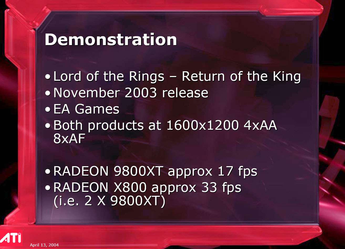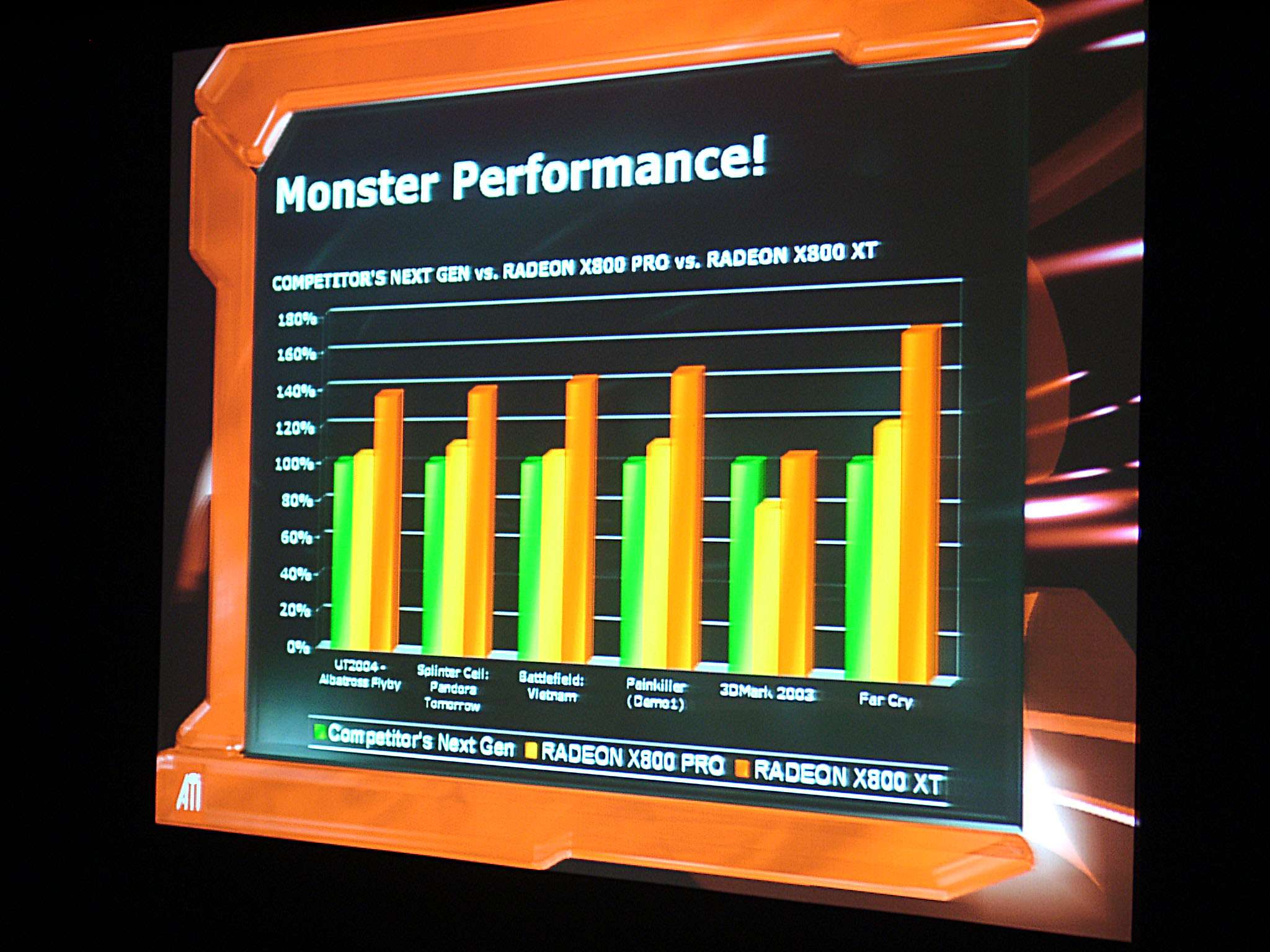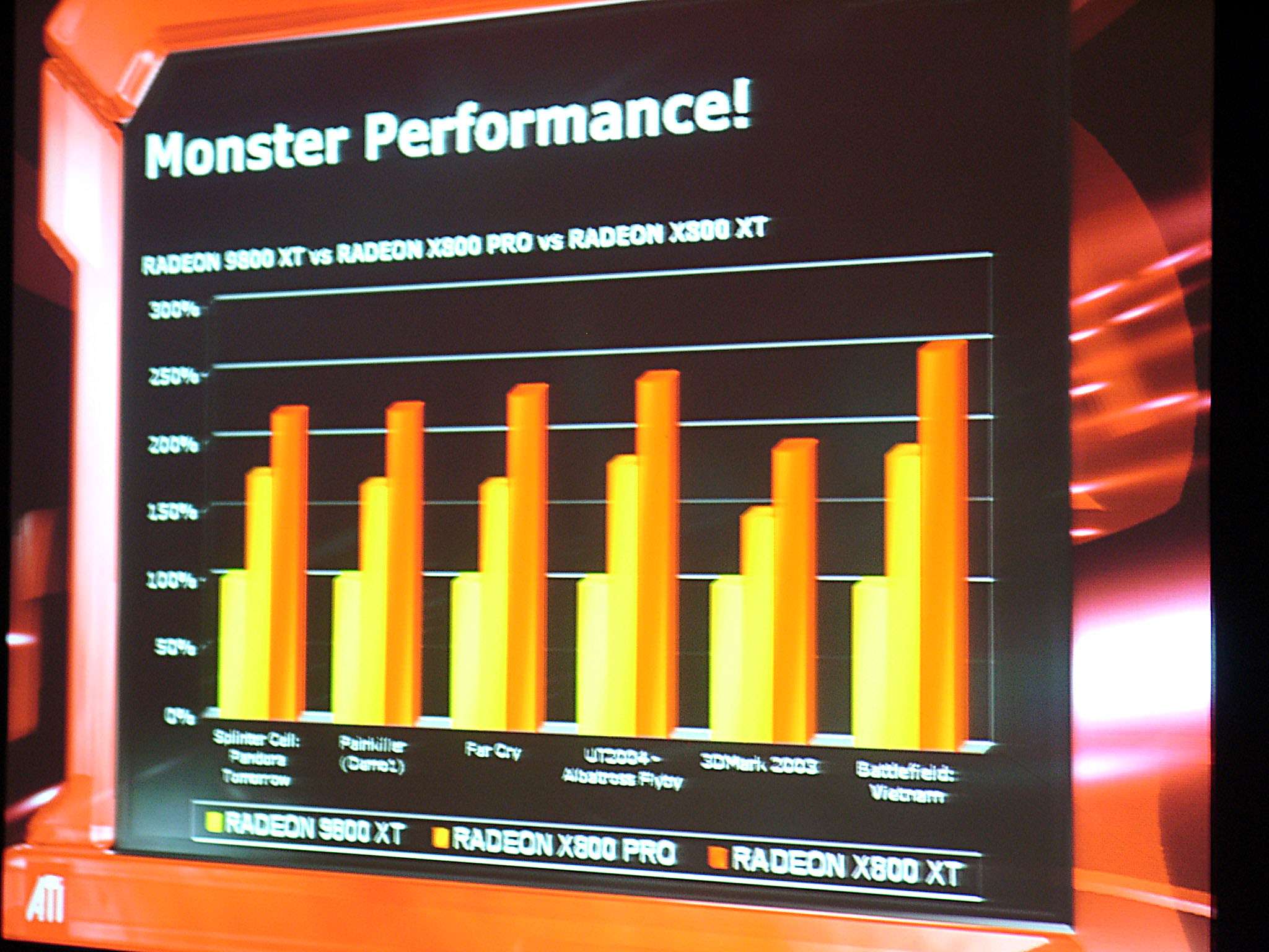 Его выступление затрагивало в целом ситуацию в ATI на сегодня, он рассказал о некоторых планах, ну и были продемонстрированы общие показатели по R420. Как можно видеть ниже, руководство компании не испытывает страха перед новинкой от конкурентов (NVIDIA), показывая на диаграммах весьма высокие скоростные параметры R420. Разумеется, о том, что у NVIDIA NV40 есть шейдеры 3.0, а у продукта из Канады их нет, предпочитают молчать, лишь при задавании вопросов на эту тему, идет ответ о том, что эта технология пока не нужна, и не зачем тратить на нее транзисторы в кристалле и людские ресурсы. Подробно об этом можно узнать, прочитав наше интервью с ведущими сотрудниками ATI.