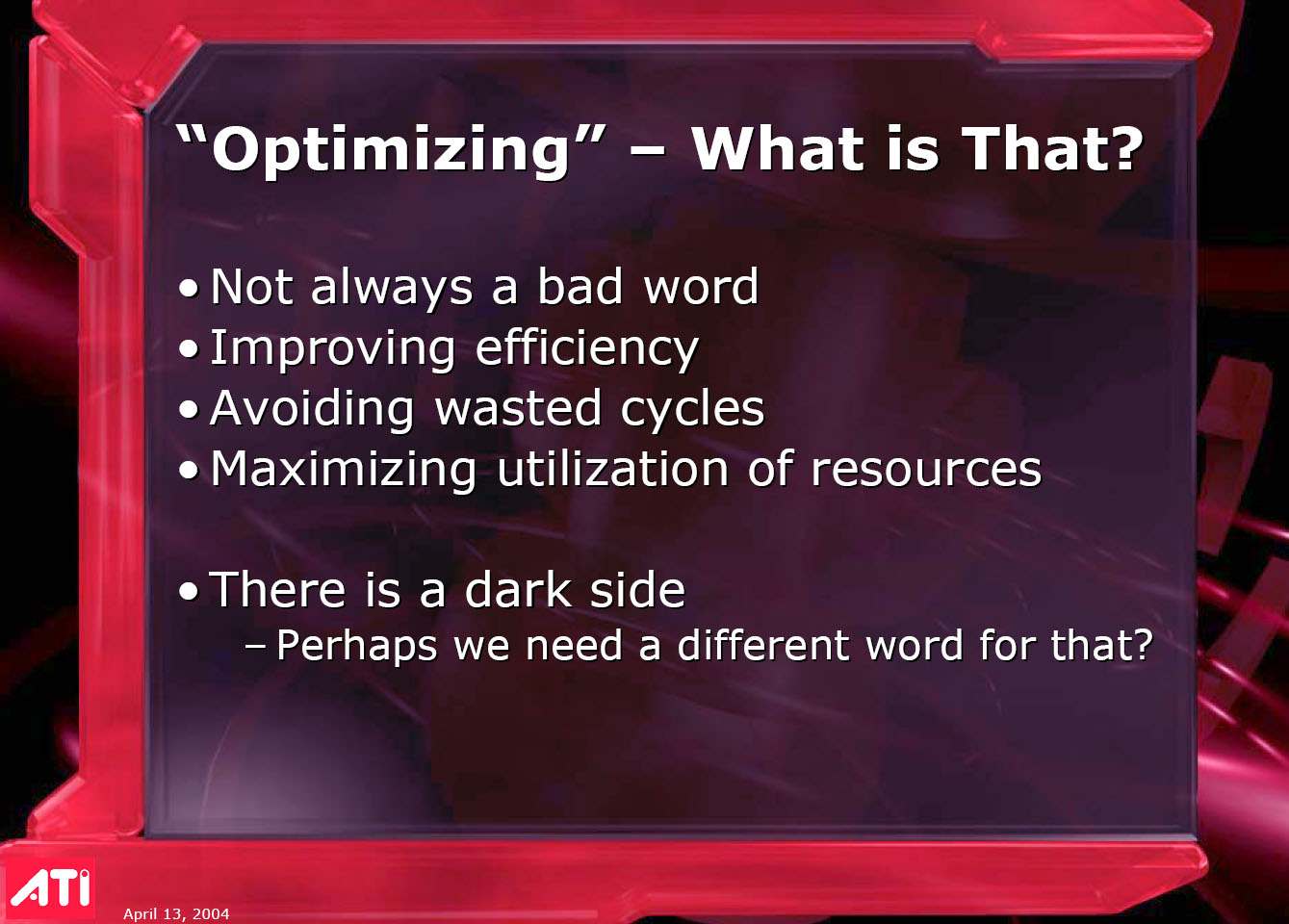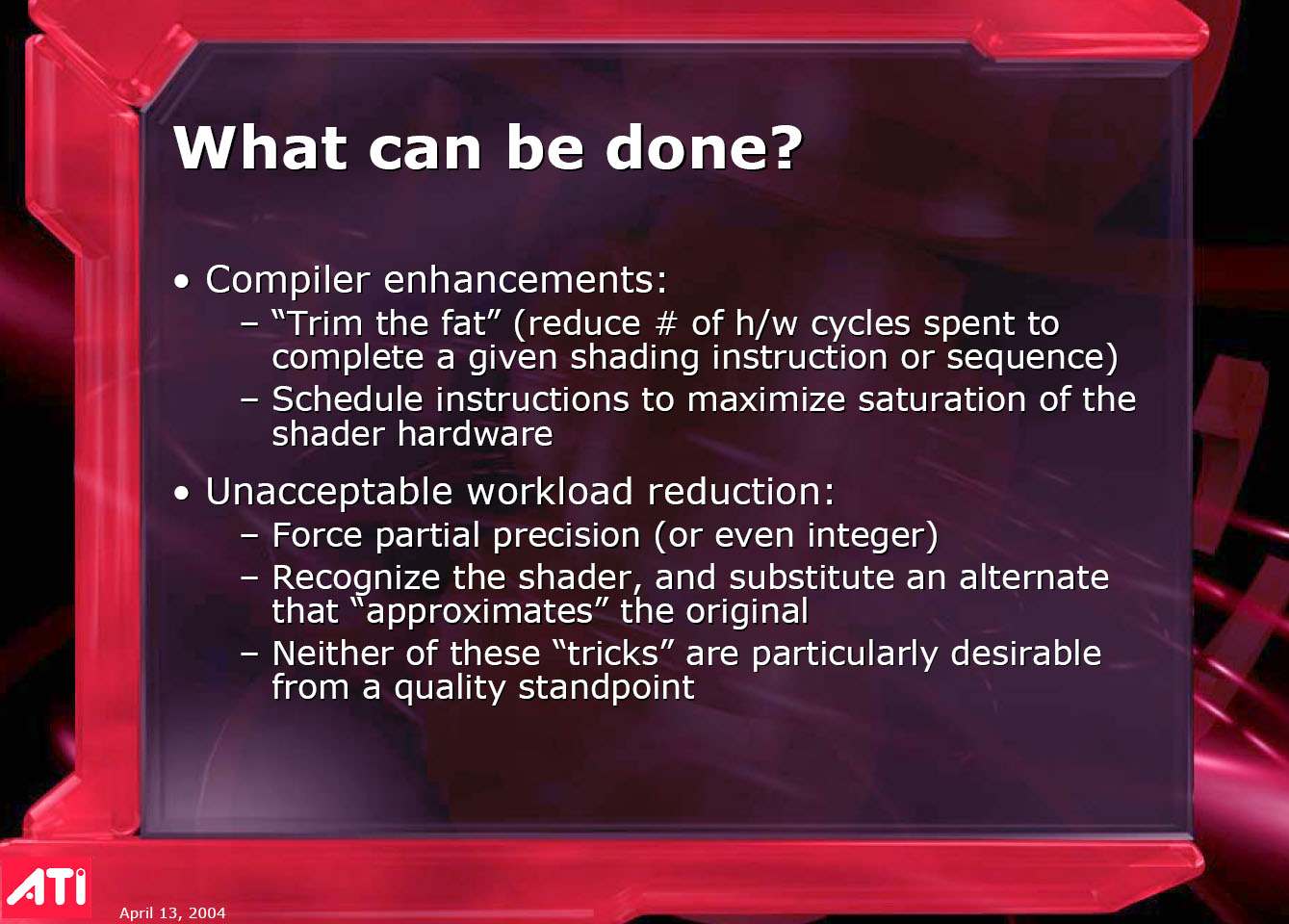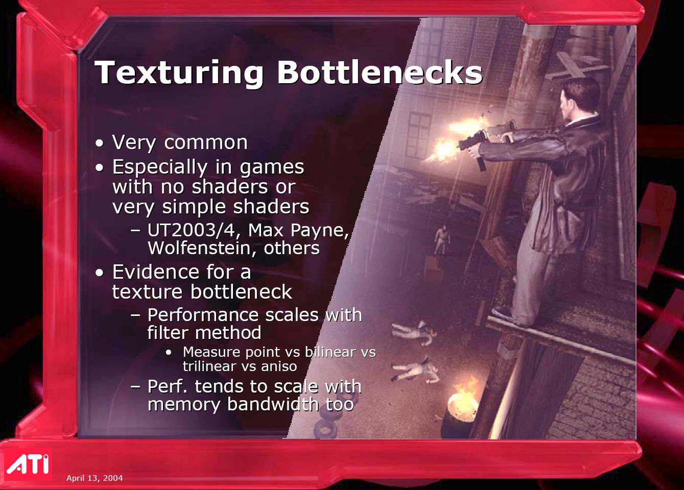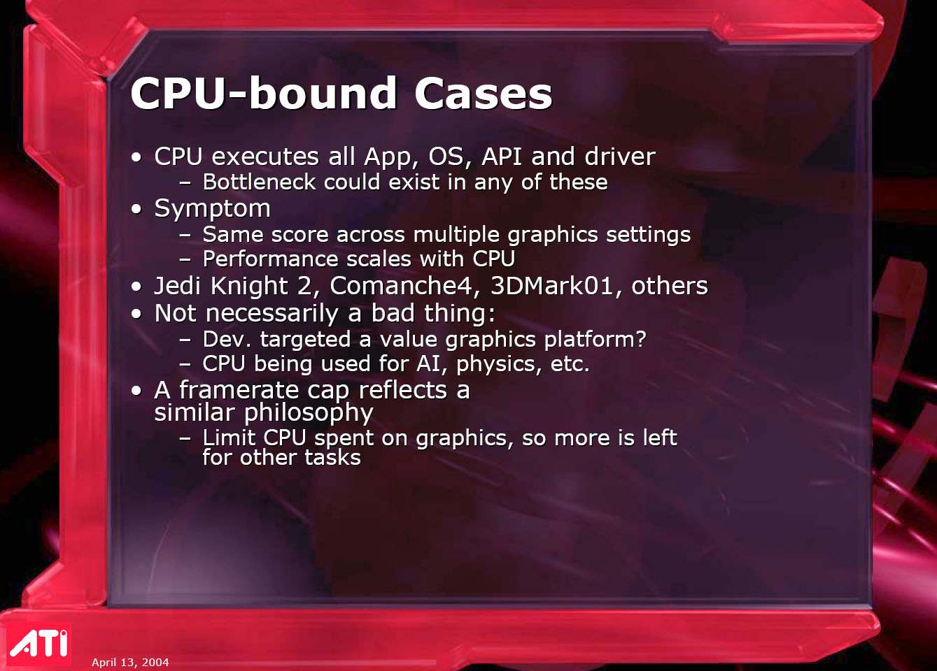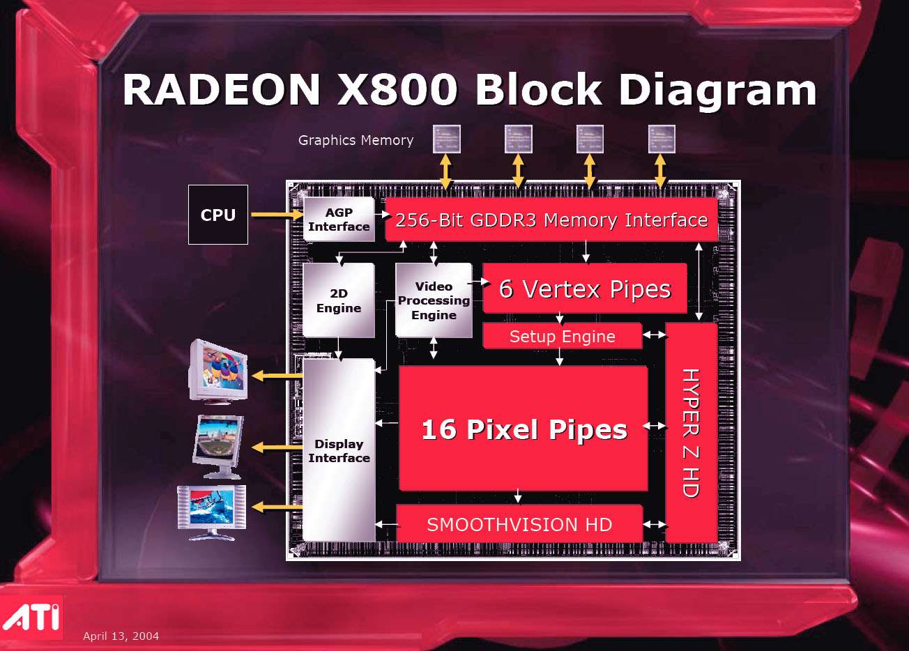 Его выступление затрагивало в целом ситуацию в ATI на сегодня, он рассказал о некоторых планах, ну и были продемонстрированы общие показатели по R420. Как можно видеть ниже, руководство компании не испытывает страха перед новинкой от конкурентов (NVIDIA), показывая на диаграммах весьма высокие скоростные параметры R420. Разумеется, о том, что у NVIDIA NV40 есть шейдеры 3.0, а у продукта из Канады их нет, предпочитают молчать, лишь при задавании вопросов на эту тему, идет ответ о том, что эта технология пока не нужна, и не зачем тратить на нее транзисторы в кристалле и людские ресурсы. Подробно об этом можно узнать, прочитав наше интервью с ведущими сотрудниками ATI.