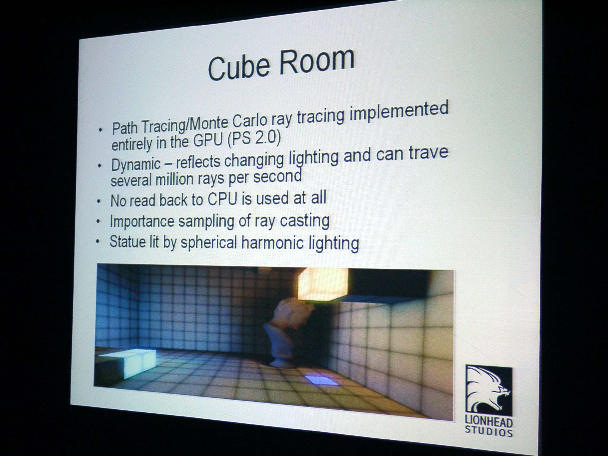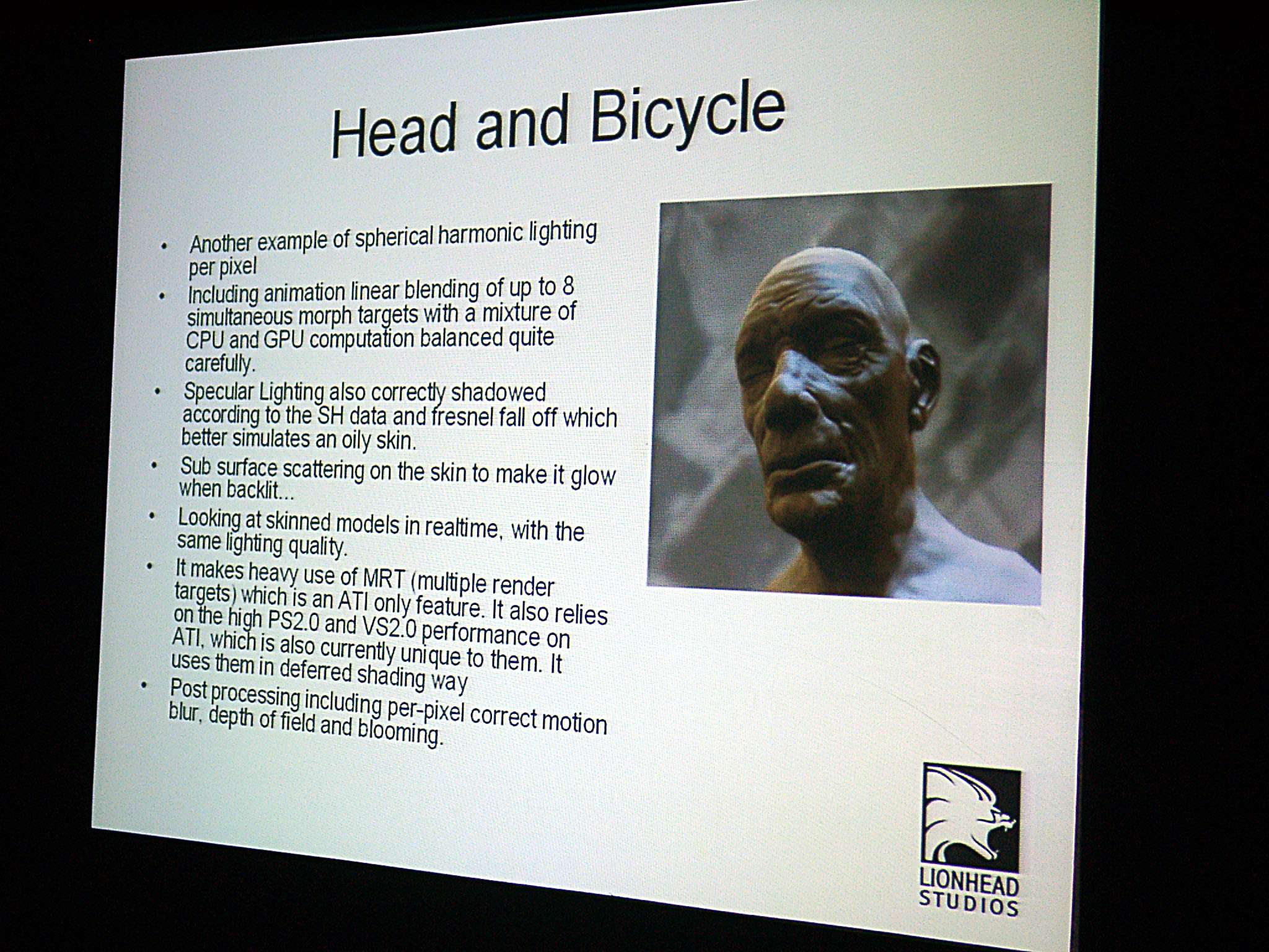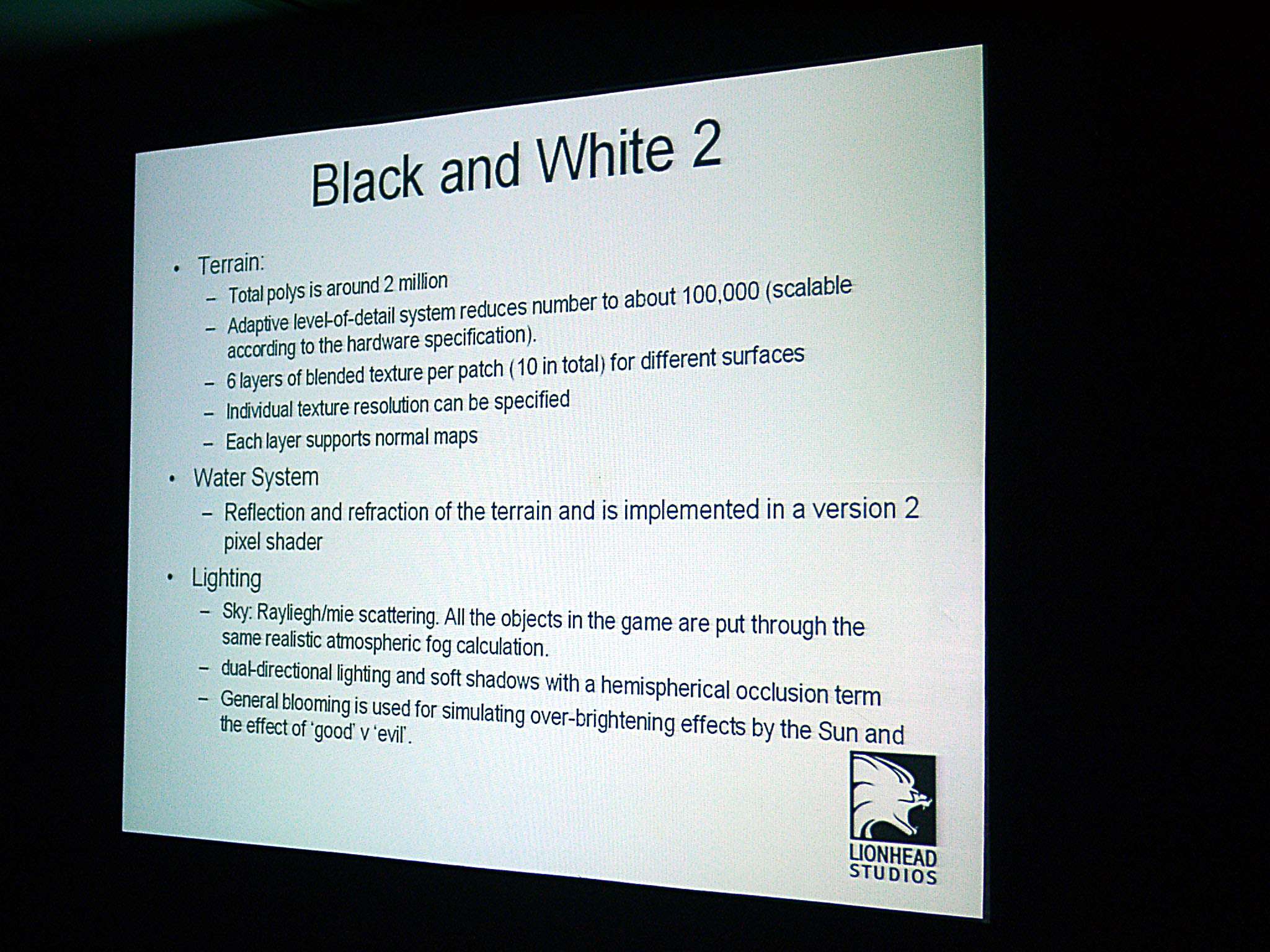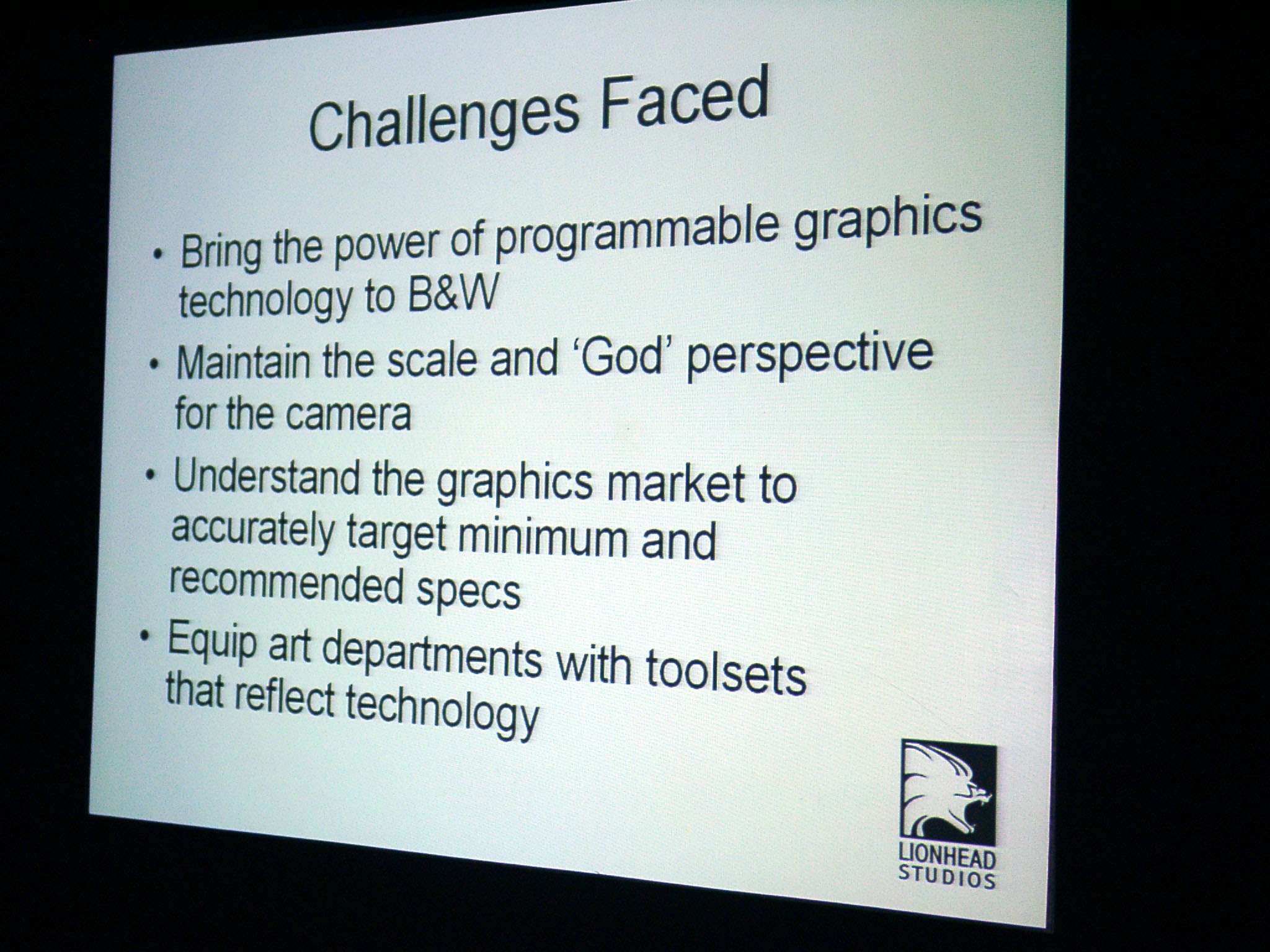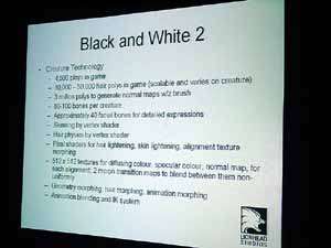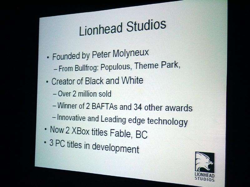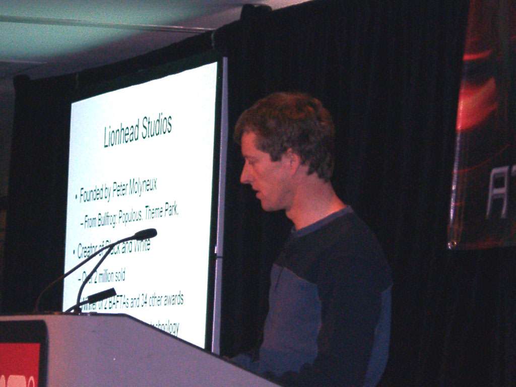 Затем выступил Тим Рэнс (Tim Rance), один из руководителей Lionhead Studios, он рассказал о будущем проекте Black & White-2, а также о некоторых технологических особенностях, которые им импонируют, и что именно им нравится в R420 в этом плане. Рассказ о новой игре сопровождался показом (3MB) трех (3MB) демо-роликов (4.8MB).