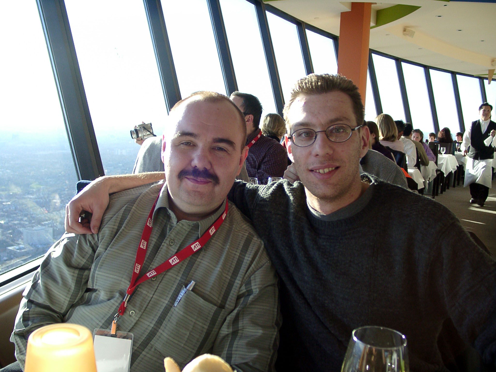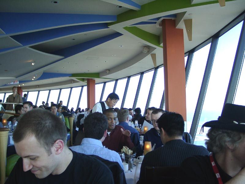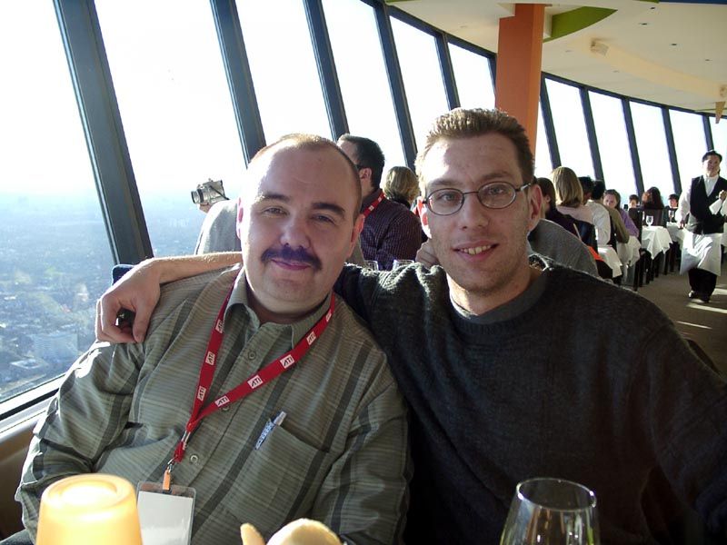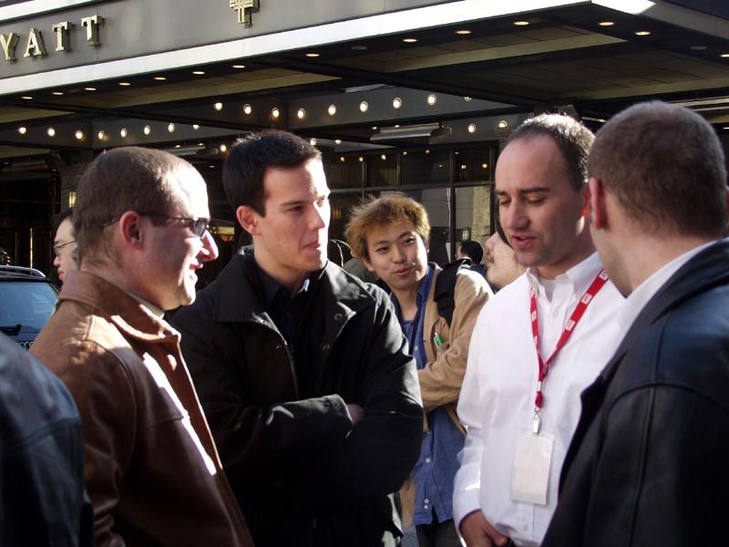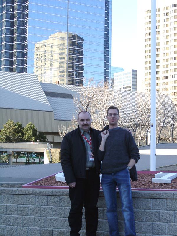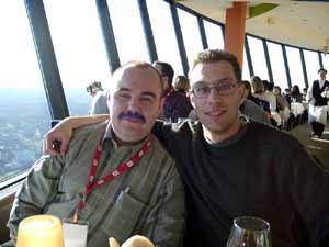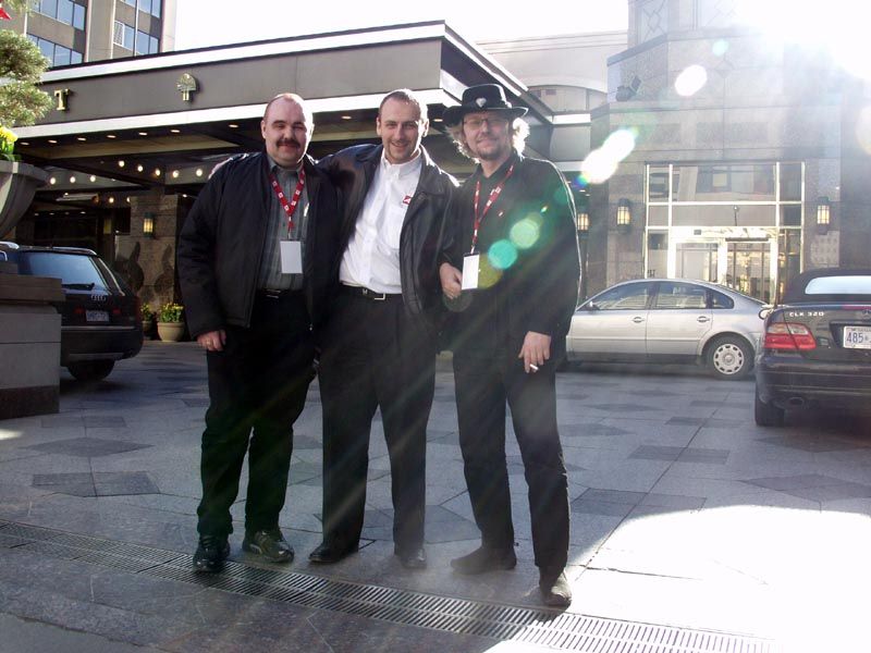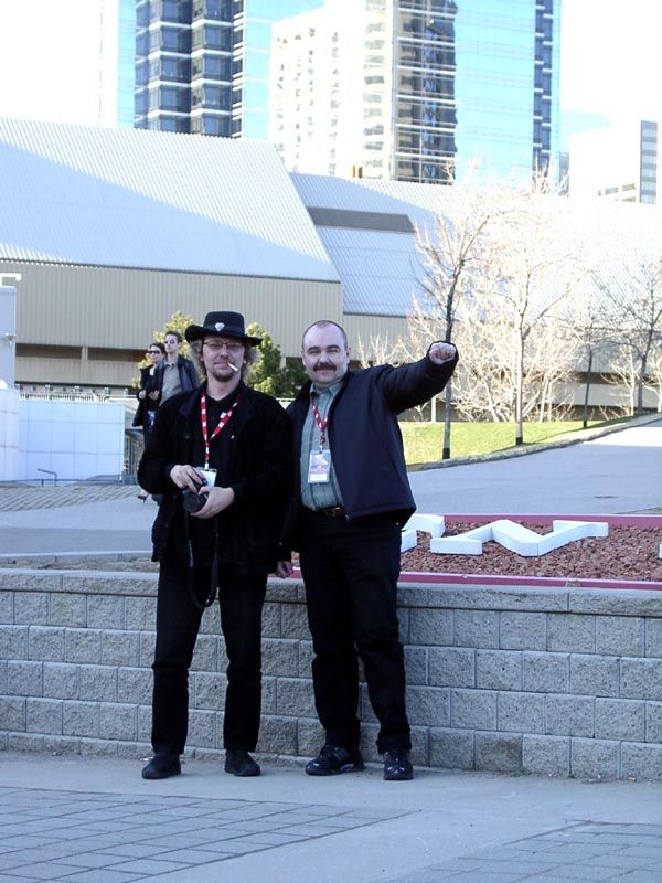 После обеда и прогулок по городу нас должны были отвезти на автобусах в CN Tower — это практически самая высокая целостная башня в мире высотой в 556 метров. Примерно на уровне 400 метров над землей имеется смотровая площадка, а также ресторан, который постоянно вращается со скоростью 1 оборот за 1 час 20 минут. Но до того мы перед входом в отель пообщались с сотрудниками ATI, в том числе с Терри Македоном (Terry Makedon) — начальником отдела по разработке CATALYST (его так и называют: Мистер Каталист) — он на снимке слева стоит между нами; а также с Крисом Хуком (директором технического маркетинга в Европе) — он на снимке справа.