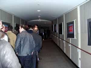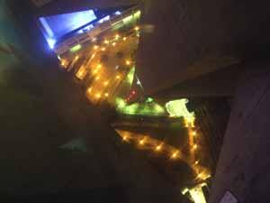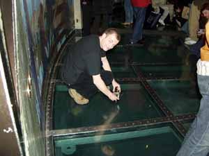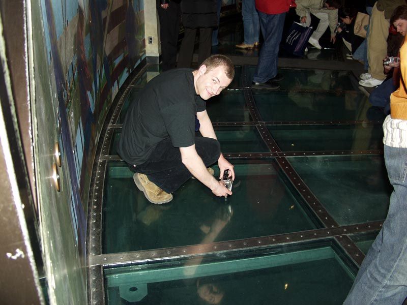 При входе в башню очередь из-за тщательной проверки людей через металлоискатель (слева). После подъема на стремительном лифте мы оказываемся на смотровой площадке. Она уникальна тем, что на площади примерно в 5 квадратных метров в пол вставлено толстое стекло, поэтому можно с ужасом смотреть вниз сквозь ноги на землю с высоты 400 метров (справа).