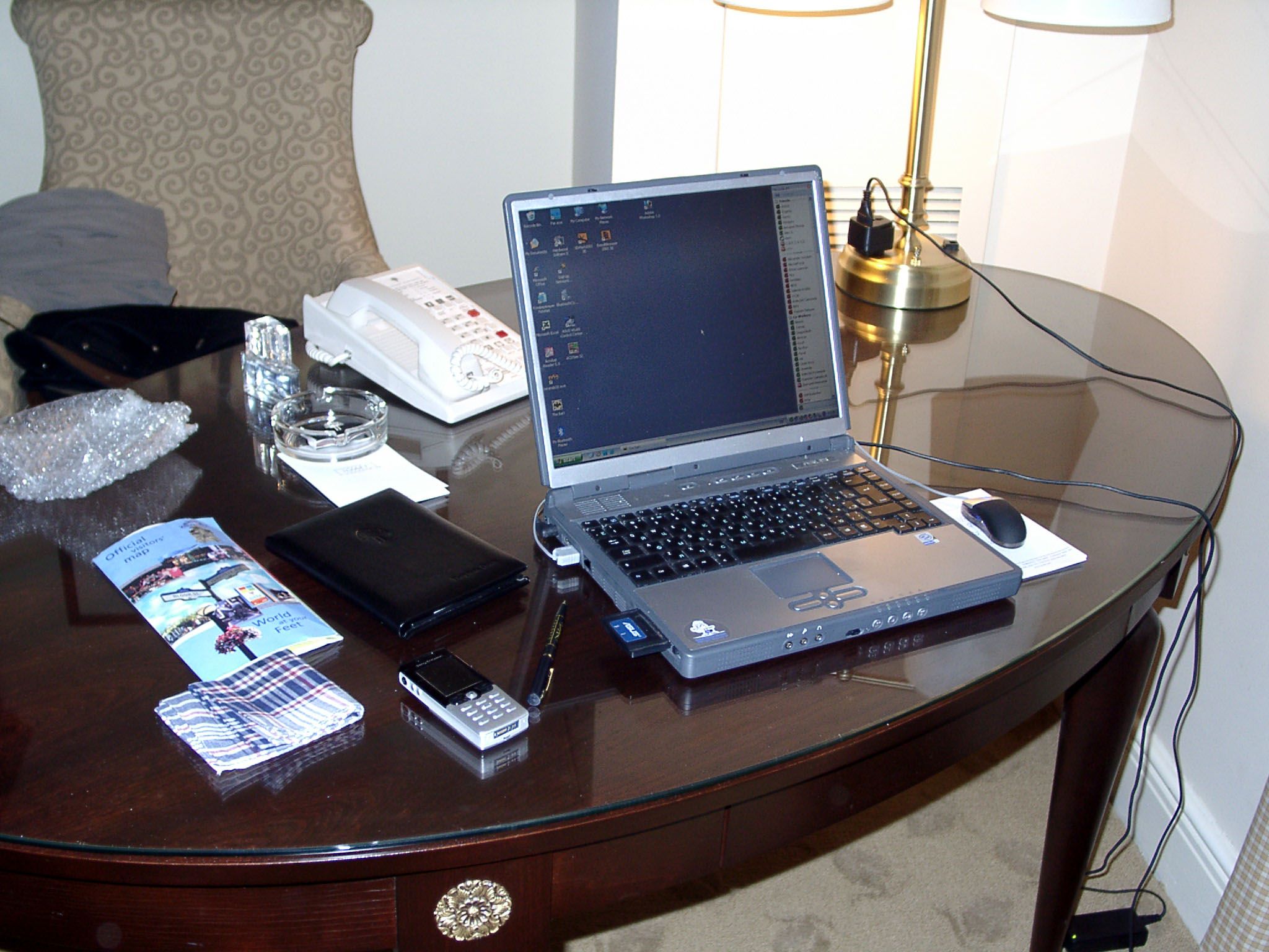 Как обычно, утро начинается… с компьютера :). И как же не воспользоваться бесплатно прилагаемым интернетом в отеле? На снимке слева видно, что из стола тянется черный кабель с RG45, который можно вставить в сетевой разъем ноутбука, и интернет станет доступным. Скорость — 100 Мбит в секунду.