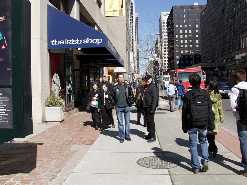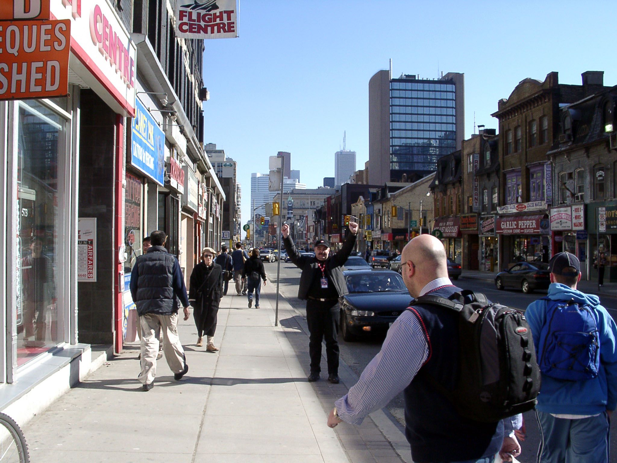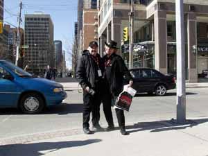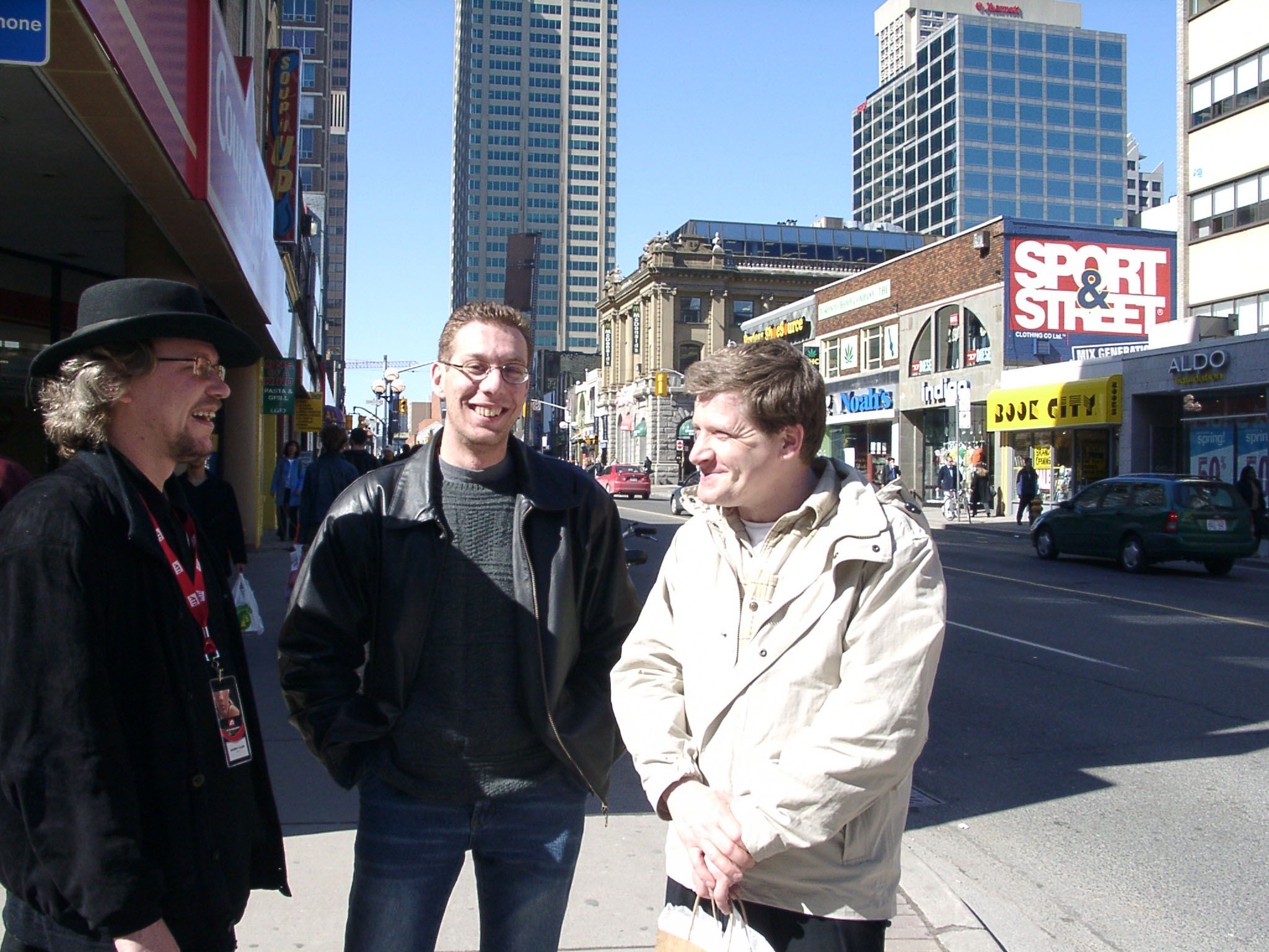 И вот мы подошли к самой длинной улице города Young Street. Она прямая и тянется от набережной озера до глубоких окраин Торонто. Мы уже вышли на саму улицу, прошли несколько метров, как заметили, что некий человек как-то странно за нами наблюдает, не решаясь подойти. В конце концов он решается (на снимке справа). Он просто услышал нашу русскую речь и ему очень захотелось пообщаться. Он тоже русский, работает в Канаде, но постоянно мотается по делам, поэтому трудно сказать — где живет :). Занимается тоже IT-технологиями, поэтому с ним было интересно поболтать.