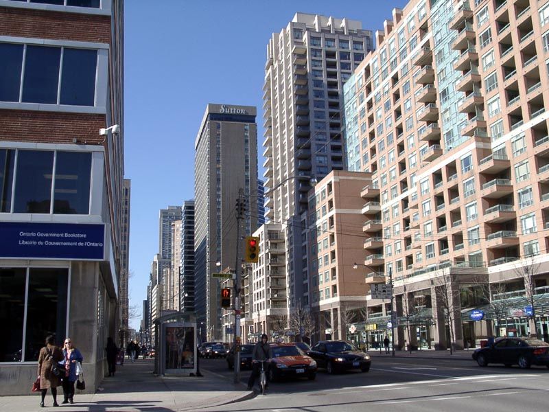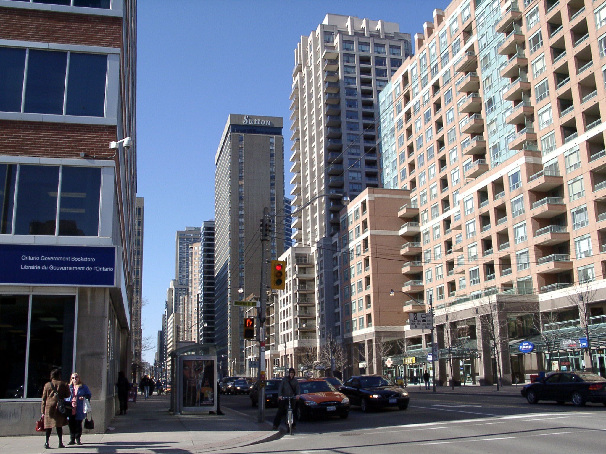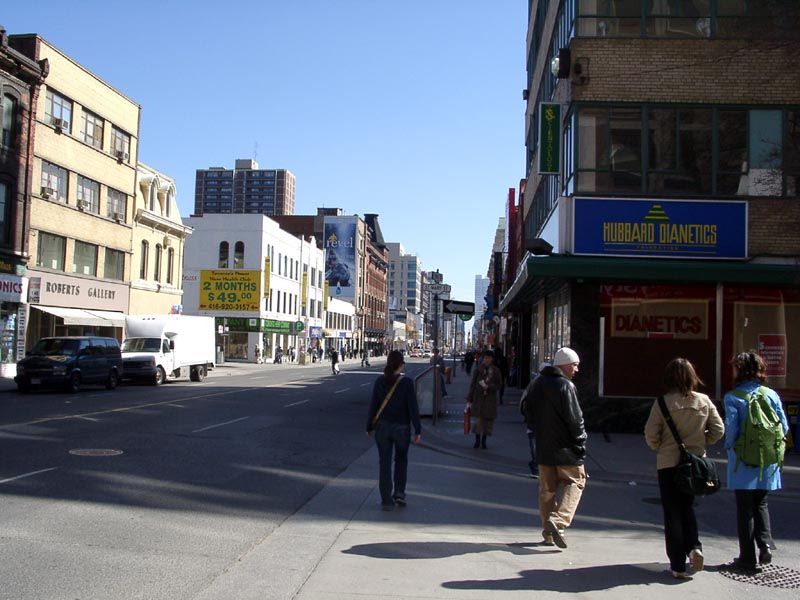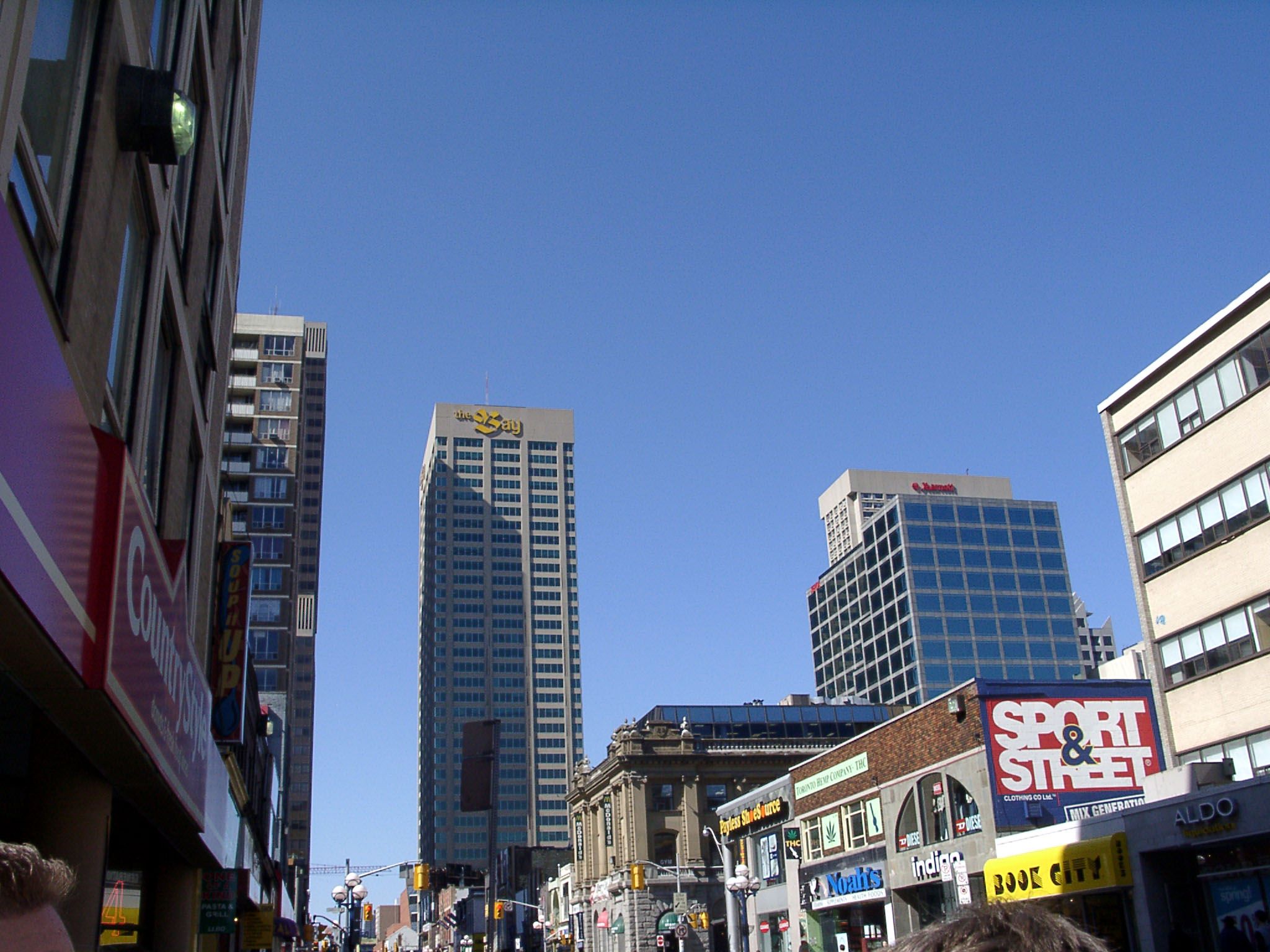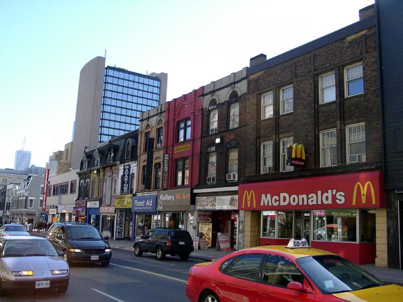 Итак, самая длинная улица. Мне с самого начала понравились вообще такие сочетания в Торонто высоких зданий и двухэтажных домиков вдоль некоторых улиц. Посмотрите сами, в этом есть свое очарование. На последнем кадре нижеприведенного блока фотографий можно увидеть вездесущий Макдональдс. Как я уже отмечал, в Торонто это забегаловка, куда ходят в основном только с детьми. Надо сказать, что качество еды там сильно выше, чем в московских аналогичных «ресторанах».