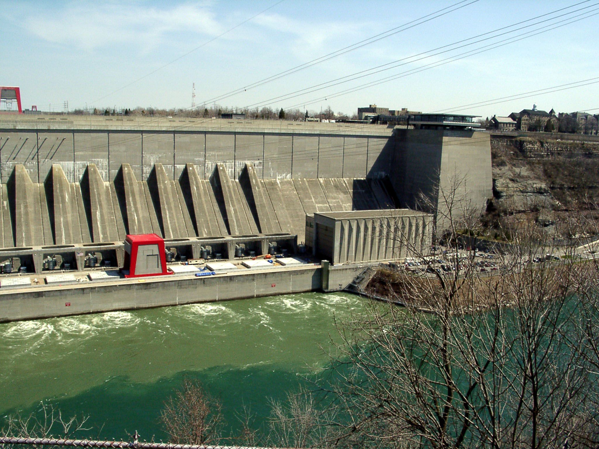 Бурная жизнь реки не окончилась тем водопадом, впереди еще пороги и водовороты. Это хорошо видно из блока снимков выше. Для любителей экзотики повисеть над бурунами воды сооружена канатная переправа (впрочем, и как траспортное средство она может неплохо использоваться). Ниже показана мощная электростанция, снабжающая электроэнергией довольно большую территорию США.